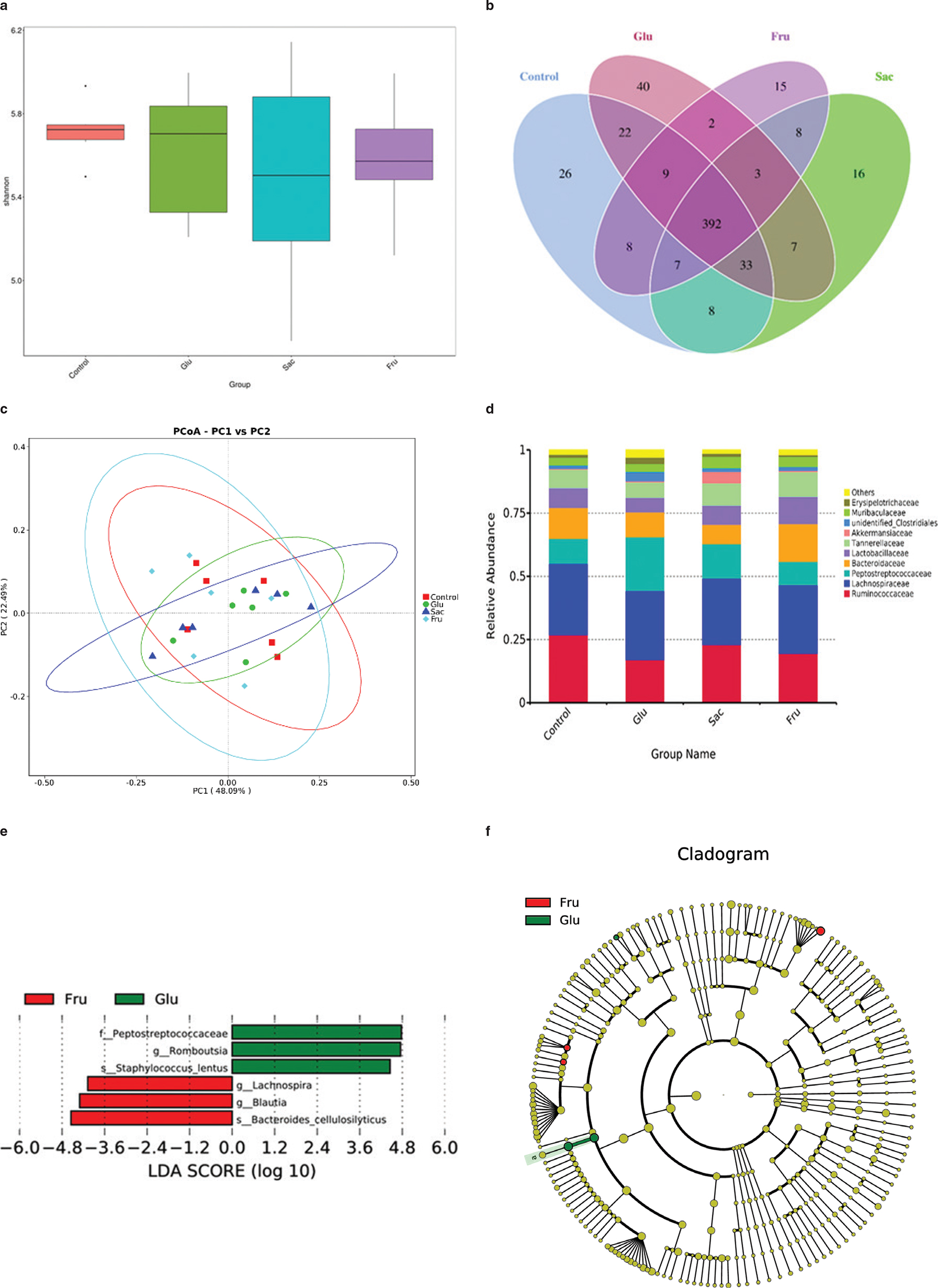Fig. 6. Analysis of the gut microbial community by 16S rRNA pyrosequencing from feces of Con, Glu, Sac and Fru groups. (a) Shannon’s diversity indices; (b) A Venn diagram displaying the degree of overlap of bacterial OTUs among the four groups; (c) principal coordinate analysis (PCoA) generated using a weighted Unifrac distance metrics. (d) Relative abundances plot of bacterial family; (e) Linear discriminant analysis (LDA), along with effect size measurements, was applied to identify enriched bacterial genera. Most enriched and depleted genera (LDA score (log10) > 2.0 were consider significant) in the Fru (red) vs.Glu (green); (f) Relative abundance cladogram of bacterial taxa. Data represent means ± SD (n = 6).