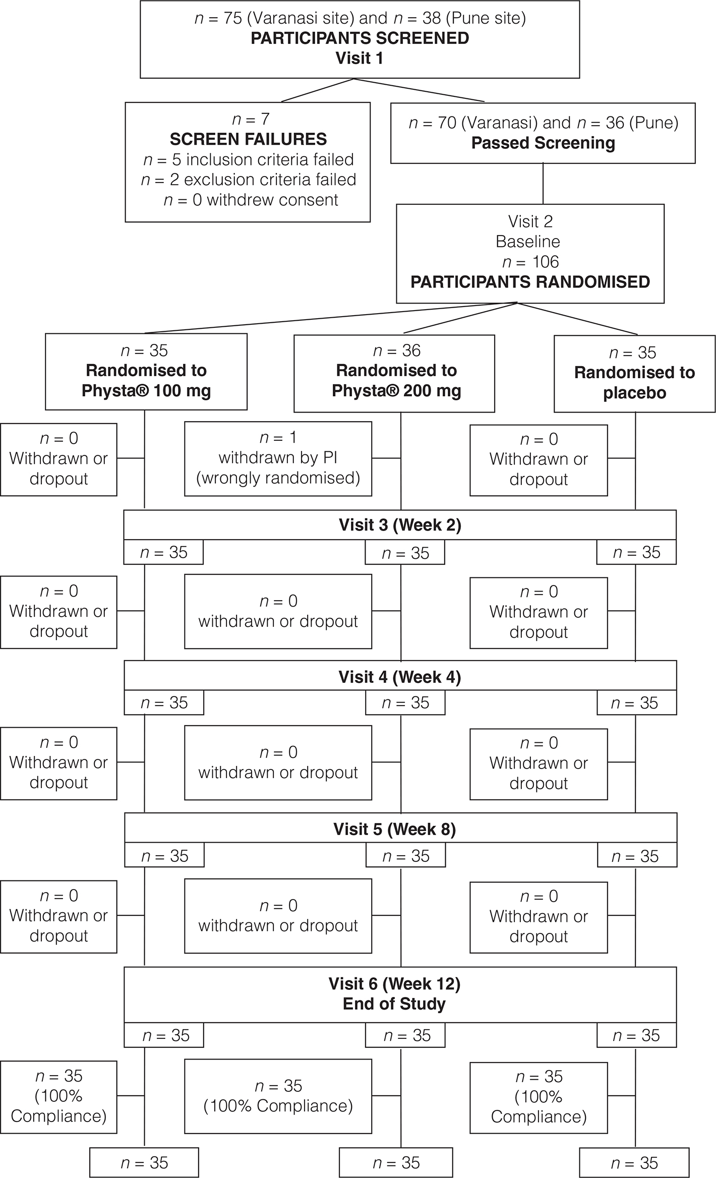 A total of 113 subjects were screened at two study sites, 106 were enrolled and one subject who found to be enrolled into wrong group was excluded after randomisation (visit 2); 105 subjects completed the study with 35 subjects each in Physta® 100 mg, Physta® 200 mg and placebo group. Demographic characteristics indicated that the study population was homogeneous, with no statistically significant differences between the groups at baseline (Table 1). The mean compliance for Physta® 100 mg, Physta® 200 mg and placebo groups was 100% (Fig. 1).