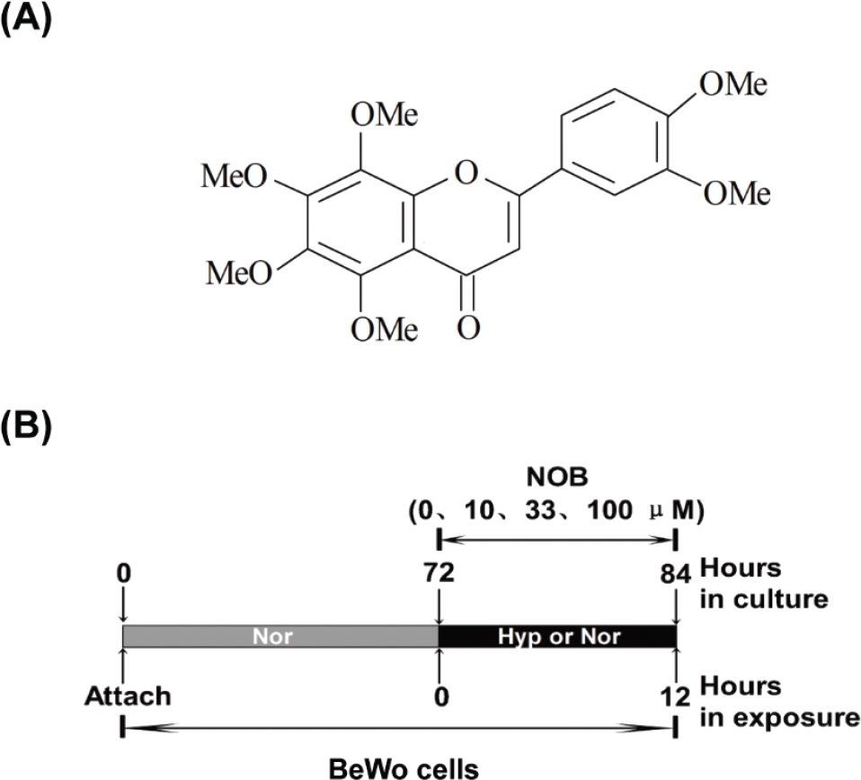 JEG-3 cells were seeded at a density of 1 × 105 cells/mL in sterile culture flasks, were cultured in DMEM (high glucose) with 10% (v/v) FBS and 100 μg/mL penicillin/streptomycin, and incubated in an incubator containing 95% air and 5% carbon dioxide at 37°C. Seeded at a density of 1 × 105 cells/mL in sterile culture flasks, BeWo cells were cultured in F12 (Ham) medium with 15% (v/v) FBS and 100 μg/mL penicillin/streptomycin, and incubated in an incubator containing 95% air and 5% carbon dioxide at 37°C. Reaching the density of 80%, the cells (JEG-3 and BeWo) were passaged using trypsin-EDTA solution and sub-cultured in new flasks. Cell culture media were replaced every 3 days for BeWo cells and every 2 days for JEG-3 cells. As for JEG-3 cells, NOB and cobalt chloride were, respectively, dissolved in DMEM (high glucose) containing 0.1% DMSO. The DMEM (high glucose) in the control group only contained DMSO (0.1%). With regard to BeWo cells, NOB and cobalt chloride were, respectively, dissolved in F12 (Ham) medium containing 0.1% DMSO. The F12 (Ham) medium in the control group only contained DMSO (0.1%).