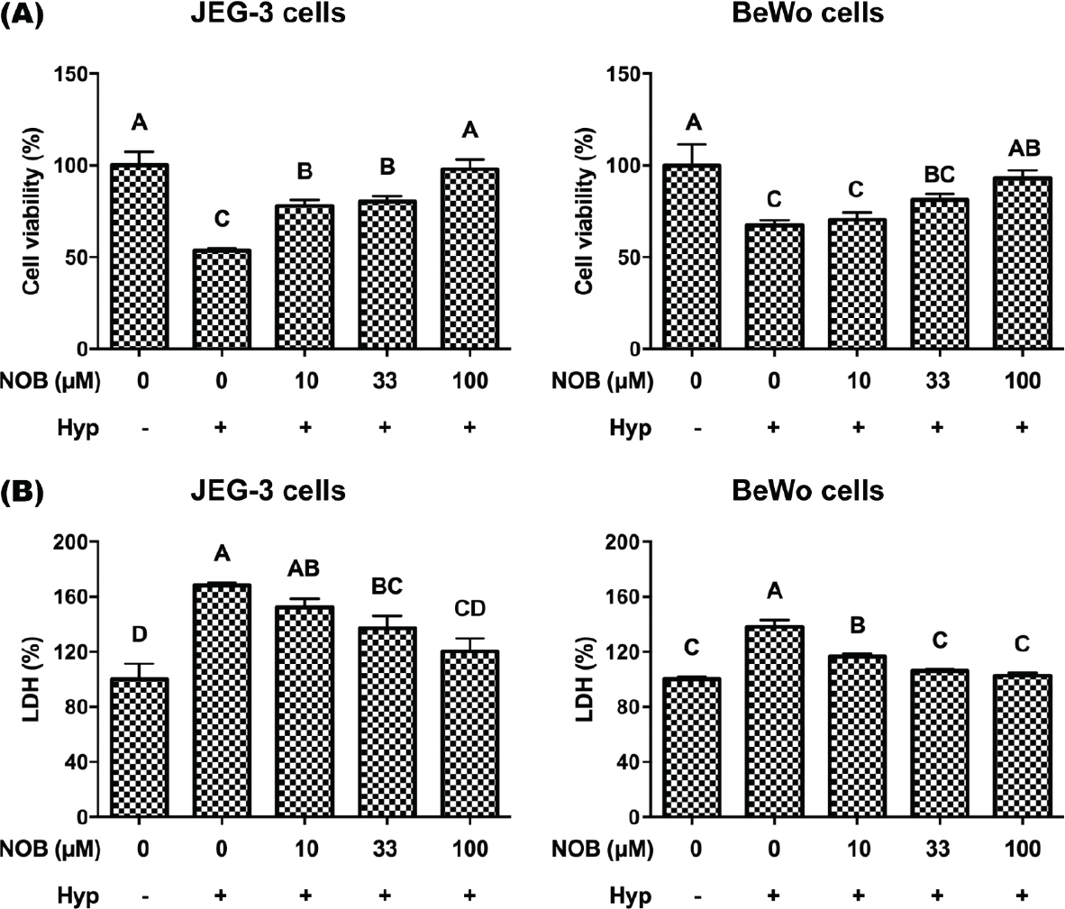 Fig. 2. Cell activity and cell membrane integrity of JEG-3 and BeWo were inhibited by hypoxia and could be rescued by NOB. (a) The cell activity was measured using a CCK-8 assay. (b) The cell membrane integrity was measured through the viability of LDH. The JEG-3 and BeWo cells were, respectively, exposed to 0, 10, 33, or 100 μM NOB with 500 μM cobalt chloride in Serum-free medium for 12 h. Cells treated without cobalt chloride and NOB for 12 h were taken as the normoxic control group. The values are presented as the mean ± SD of independent experiments (n = 3). All different capital letters indicate significant differences at P < 0.05 using one-way ANOVA.