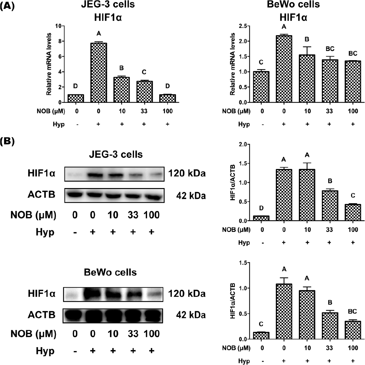 Fig. 3. NOB up-regulated the mRNA and protein levels of HIF1α in JEG-3 and BeWo exposed to hypoxia. (a) The mRNA expressions of HIF1α in JEG-3 and BeWo cells were estimated by RT-qPCR analyses. (b) The protein expressions of HIF1α in JEG-3 and BeWo cells were estimated by Western blot analysis. The JEG-3 and BeWo cells were, respectively, exposed to 0, 10, 33, or 100 μM NOB with 500 μM cobalt chloride in Serum-free medium for 12 h. Cells treated without cobalt chloride and NOB for 12 h were taken as the normoxic control group. The values are presented as the mean ± SD of independent experiments (n = 3). All different capital letters indicate significant differences at P < 0.05 using one-way ANOVA.