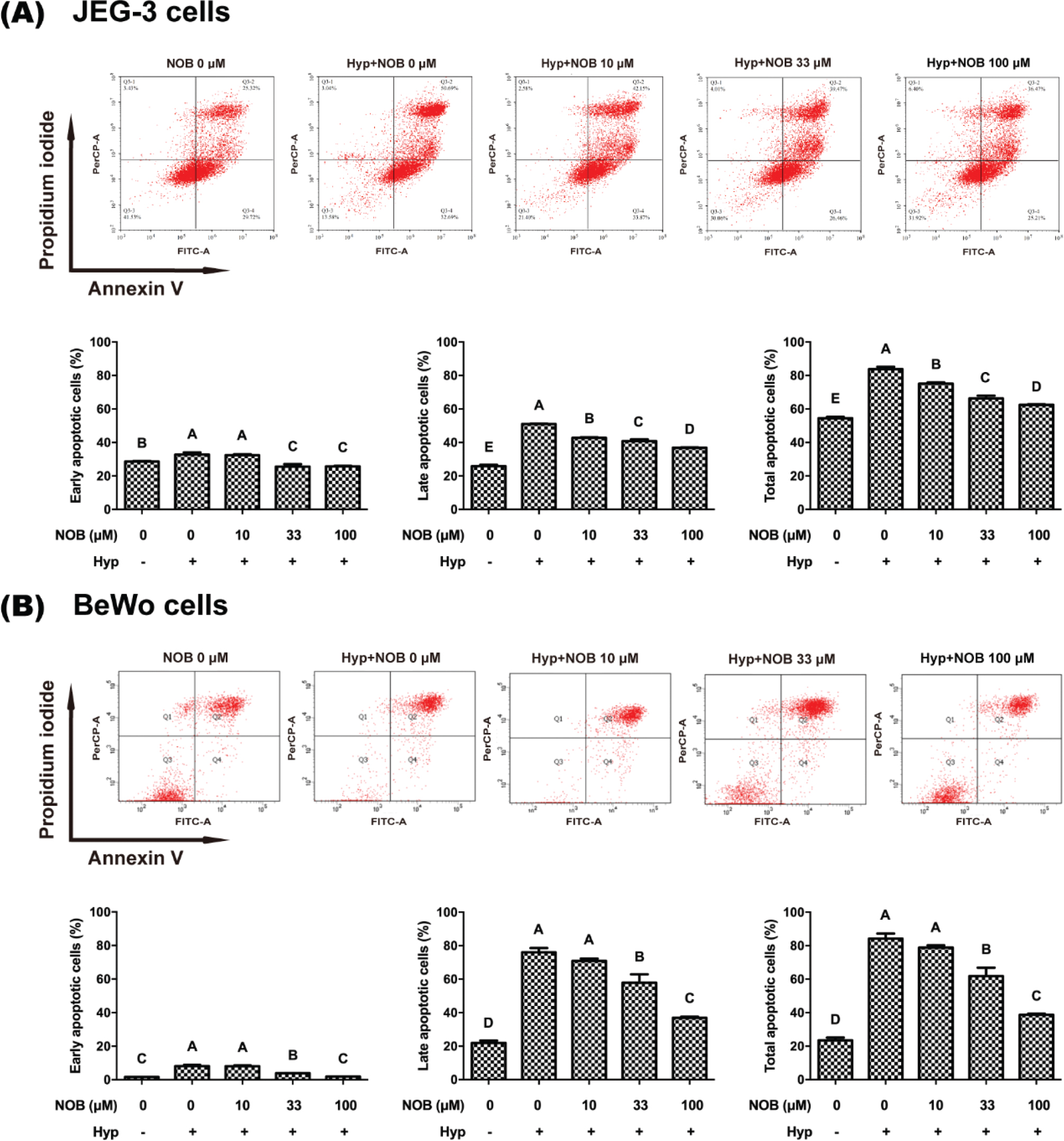 Fig. 4. NOB attenuated hypoxia-mediated apoptosis in JEG-3 and BeWo cells. The apoptosis of JEG-3 and BeWo cells was detected by flow cytometry with Annexin V and PI double staining. (a) The apoptosis degrees of JEG-3 cells. (b) The apoptosis degrees of BeWo cells. The JEG-3 and BeWo cells were, respectively, exposed to 0, 10, 33, or 100 μM NOB with 500 μM cobalt chloride in Serum-free medium for 12 h. Cells treated without cobalt chloride and NOB for 12 h were taken as the normoxic control group. The values are presented as the mean ± SD of independent experiments (n = 3). All different capital letters indicate significant differences at P < 0.05 using one-way ANOVA.