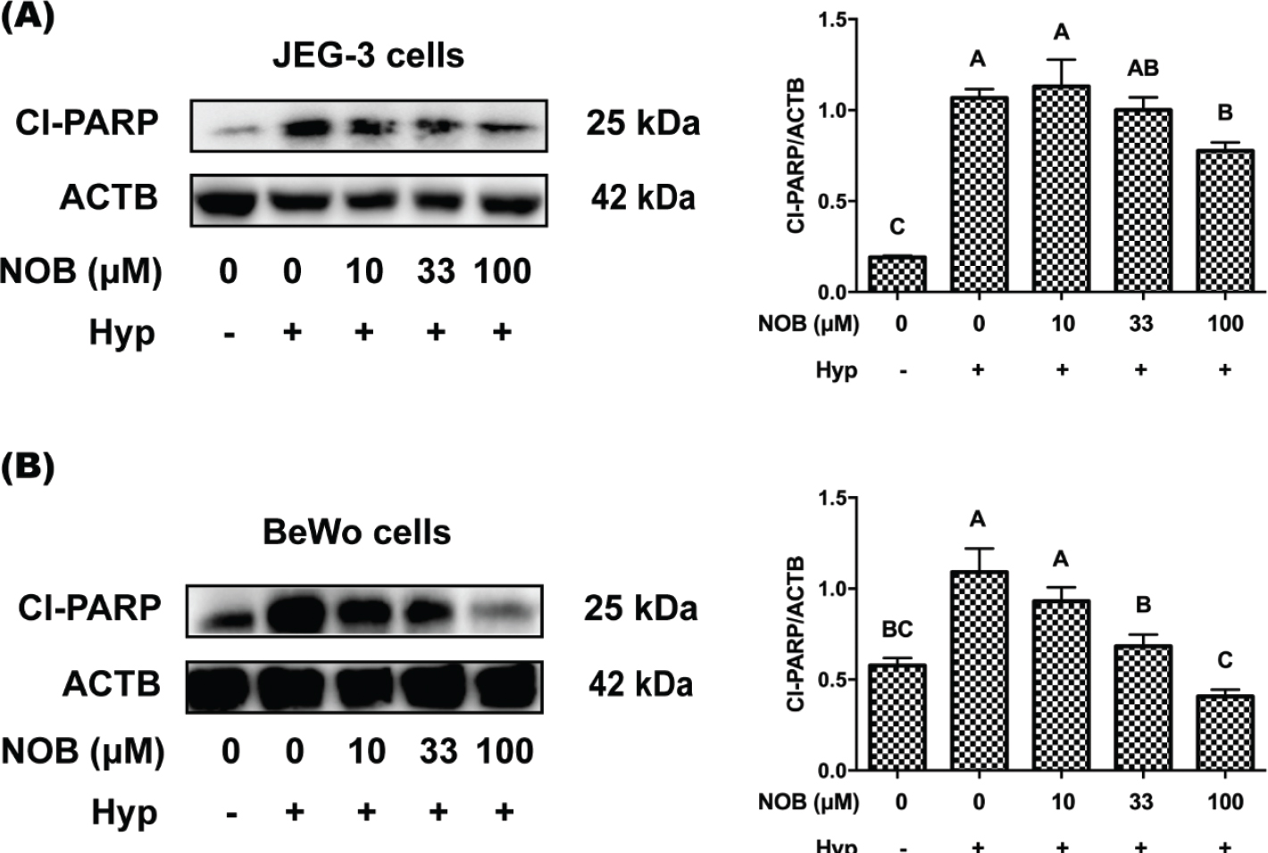 Fig. 5. The effect of NOB on apoptosis marker protein of hypoxia-induced JEG-3 and BeWo cells. The expression of cleaved PARP (cl-PARP) was estimated by Western blot analysis. (a) The cl-PARP levels of JEG-3 cells. (b) The cl-PARP levels of BeWo cells. The JEG-3 and BeWo cells were, respectively, exposed to 0, 10, 33, or 100 μM NOB with 500 μM cobalt chloride in Serum-free medium for 12 h. Cells treated without cobalt chloride and NOB for 12 h were taken as the normoxic control group. The values are presented as the mean ± SD of independent experiments (n = 3). All different capital letters indicate significant differences at P < 0.05 using one-way ANOVA.