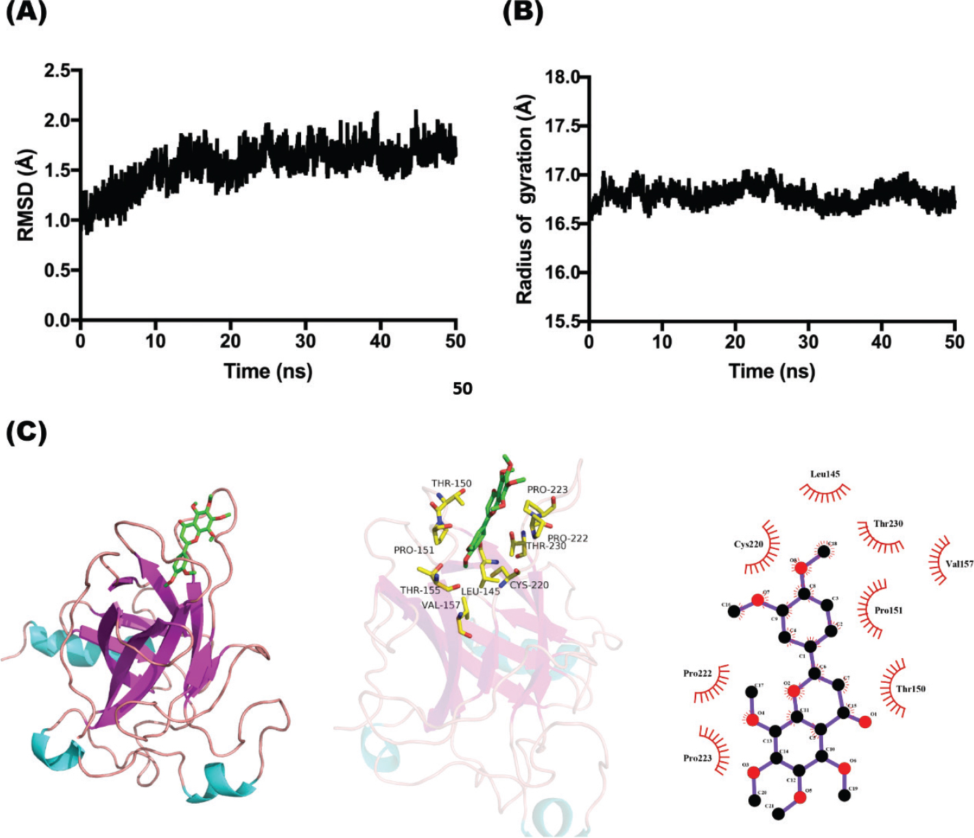 Furthermore, the binding free energy was calculated for the 25-50 ns (after dynamics trajectory equilibrium) conformation, and the results are shown in Table 3. NOB and p53 protein bonded well, and its binding free energy was estimated to be −26.4 ± 3.38 kcal/mol; the essential driving force involved was van der Waals interactions. The view of the interaction between NOB and p53 protein after 50 ns dynamics simulation is shown in Fig. 6c. NOB interacted with Leu145, Thr150, Pro151, Thr155, Val157, Cys220, Pro222, Pro223, and Thr230 in the flexible ring region of p53.
