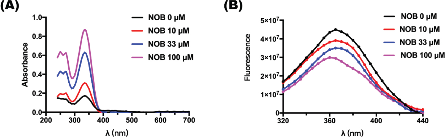 p53 protein was mixed with the same volume of NOB and maintained for 10 min under 37°C. The final concentration of p53 was 1 μM, and those of NOB were 0, 10, 33, and 100 μM. The fluorescence value of the mixture solution was determined at the wavelength range of 320–440 nm by setting the excitation slit width and the emission slit width as 5 nm, with an excitation wavelength of 280 nm.