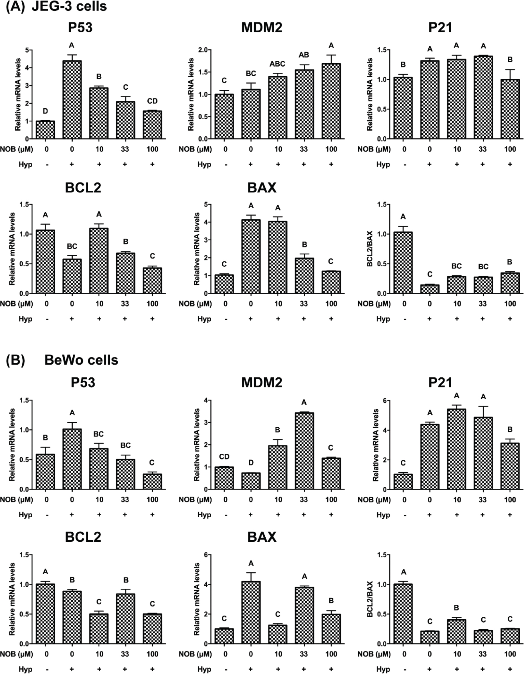 Fig. 8. The effect of NOB on expressions of p53 pathway genes of hypoxia-induced JEG-3 and BeWo cells. The mRNA expressions of p53, MDM2, p21, BCL2, and BAX were estimated by RT-qPCR. The mRNA ratio of BCL2/BAX was calculated. (a) The mRNA expression analysis of JEG-3 cells. (b) The mRNA expression analysis of BeWo cells. The JEG-3 and BeWo cells were, respectively, exposed to 0, 10, 33, or 100 μM NOB with 500 μM cobalt chloride in Serum-free medium for 12 h. Cells treated without cobalt chloride and NOB for 12 h were taken as the normoxic control group. The values are presented as the mean ± SD of independent experiments (n = 3). All different capital letters indicate significant differences at P < 0.05 using one-way ANOVA.