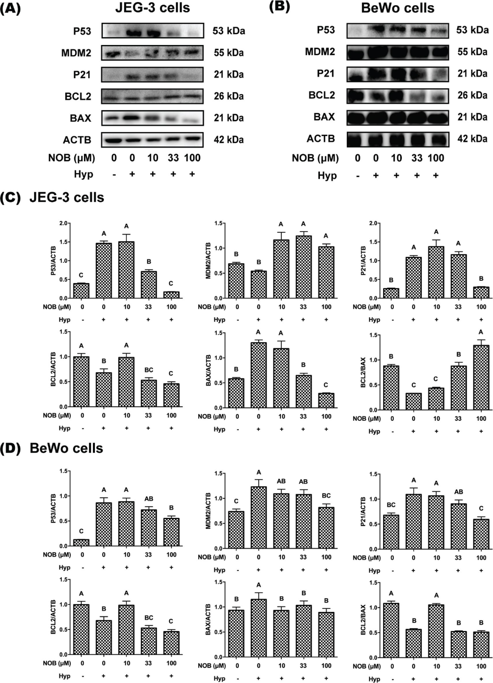 Fig. 9. The effect of NOB on expressions of p53 pathway proteins of hypoxia-induced JEG-3 and BeWo cells. The protein expressions of p53, MDM2, p21, BCL2 and BAX were estimated by Western blot analysis. The protein ratio of BCL2/BAX was calculated. (a) The Western blot of JEG-3 cells. (b) The Western blot of BeWo cells. (c) The protein expression analysis of JEG-3 cells. (d) The protein expression analysis of BeWo cells. The JEG-3 and BeWo cells were, respectively, exposed to 0, 10, 33, or 100 μM NOB with 500 μM cobalt chloride in Serum-free medium for 12 h. Cells treated without cobalt chloride and NOB for 12 h were taken as the normoxic control group. The values are presented as the mean ± SD of independent experiments (n = 3). All different capital letters indicate significant differences at P < 0.05 using one-way ANOVA.