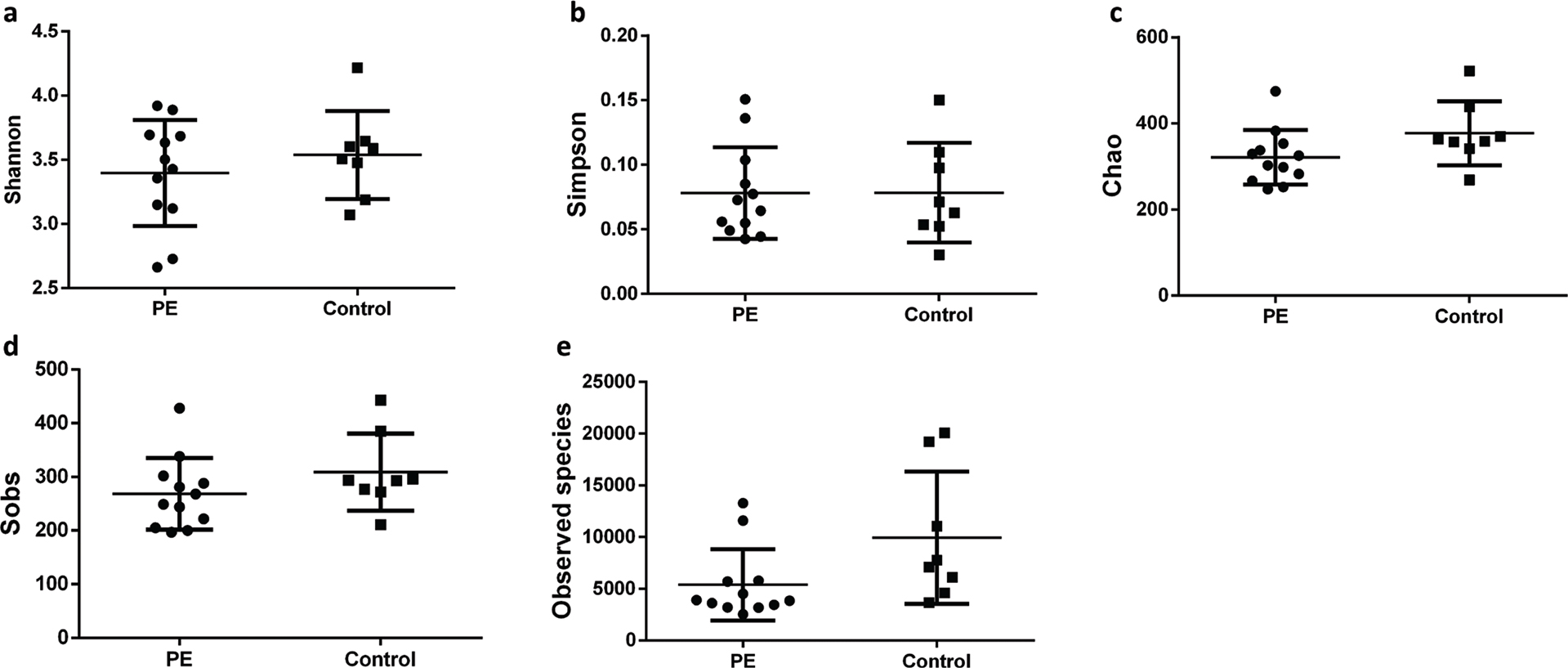 We investigated the α-diversity of GM in the two groups as described by Su and colleagues (19), which represented the mean species diversity in the overall gut. We found no significant differences in GM of the two groups. In general, the Shannon Index is used to quantify the uncertainty, whereas the Simpson Index is used to measure the degree of concentration, when individuals are classified into different types (20). However, there were no significant differences between the PE group and control group in terms of these two indices (P > 0.05) (Fig. 2a, b), although the Shannon Index decreased in the PE group. The Chao Index and Sobs Index also showed no significant differences (P > 0.05) (Fig. 2c, d), but the Chao Index and Sobs Index decreased moderately in the PE group. Meanwhile, the Observed Species Index of the control group was moderately higher than that of the PE group, although the difference was not significant (P > 0.05) (Fig. 2e). Taken together, these results showed that the species diversity in the PE group decreased, but there was higher distribution uniformity of bacteria in the PE group.
