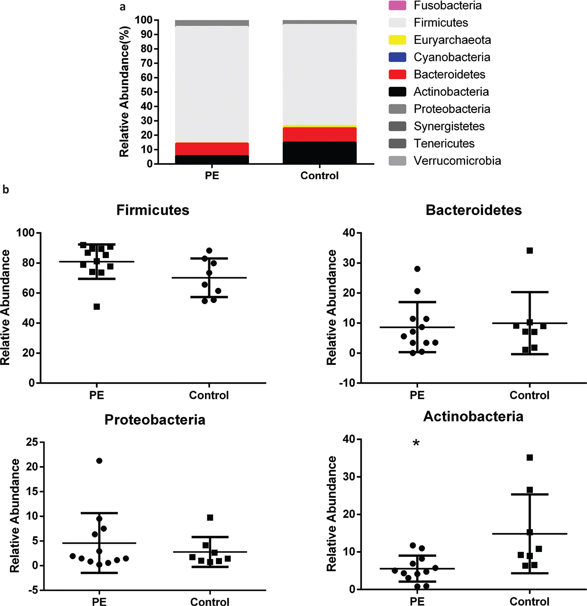 At the phylum level, the most abundant GM in the two groups were bacteria of the phylum Firmicutes (70.22–80.91%), Bacteroidetes (8.66–9.97%), Actinobacteria (5.56–14.86%), and Proteobacteria (2.8–4.6%) (Fig. 3a, Supplementary Table 1). The relative abundance of bacteria of the phylum Firmicutes in the PE group increased slightly compared with that in the control group, although the difference was not significant (P = 0.068) (Fig. 3b). The relative abundance of bacteria of the phylum Bacteroidetes was not significantly different between the two groups, although there was a decreasing trend in the PE group (P = 0.73) (Fig. 3b). In addition, the abundance of bacteria of the phylum Proteobacteria showed a slight increase but the difference was not significant (P = 0.77) (Fig. 3b). However, the relative abundance of bacteria of the phylum Actinobacteria was decreased significantly in comparison with that of the control group (P = 0.042) (Fig. 3b).