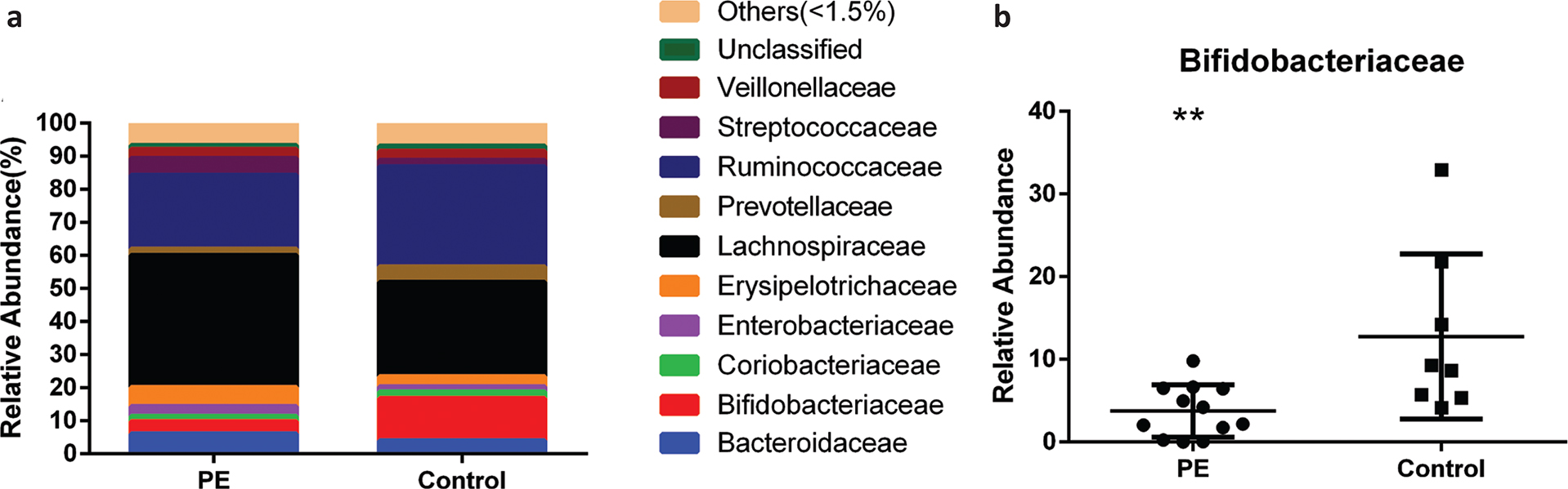 The main families of bacteria in the stool samples were Lachnospiraceae, Erysipelotrichaceae, Bifidobacteriaceae, Ruminococcaceae, Bacteroidaceae, Streptococcaceae, Enterobacteriaceae, Veillonellaceae, Prevotellaceae, and Coriobacteriaceae (Fig. 4a, Supplementary Table 2). The relative abundance of bacteria of the family Bifidobacteriaceae was 3.75% in the PE group and 12.76% in the control group, respectively, and this reduction was significant in the PE group (P = 0.039) (Fig. 4b). The relative abundance of bacteria of the families Ruminococcaceae, Prevotellaceae, and Coriobacteriaceae in the PE group decreased compared with that in the control group, but the difference was not significant (P > 0.05). The relative abundance of bacteria of the families Lachnospiraceae, Bacteroidaceae, Erysipelotrichaceae, Streptococcaceae, Enterobacteriaceae, and Veillonellaceae in the PE group increased slightly compared with that in the control group, but the difference between the two groups was not significant (P > 0.05).