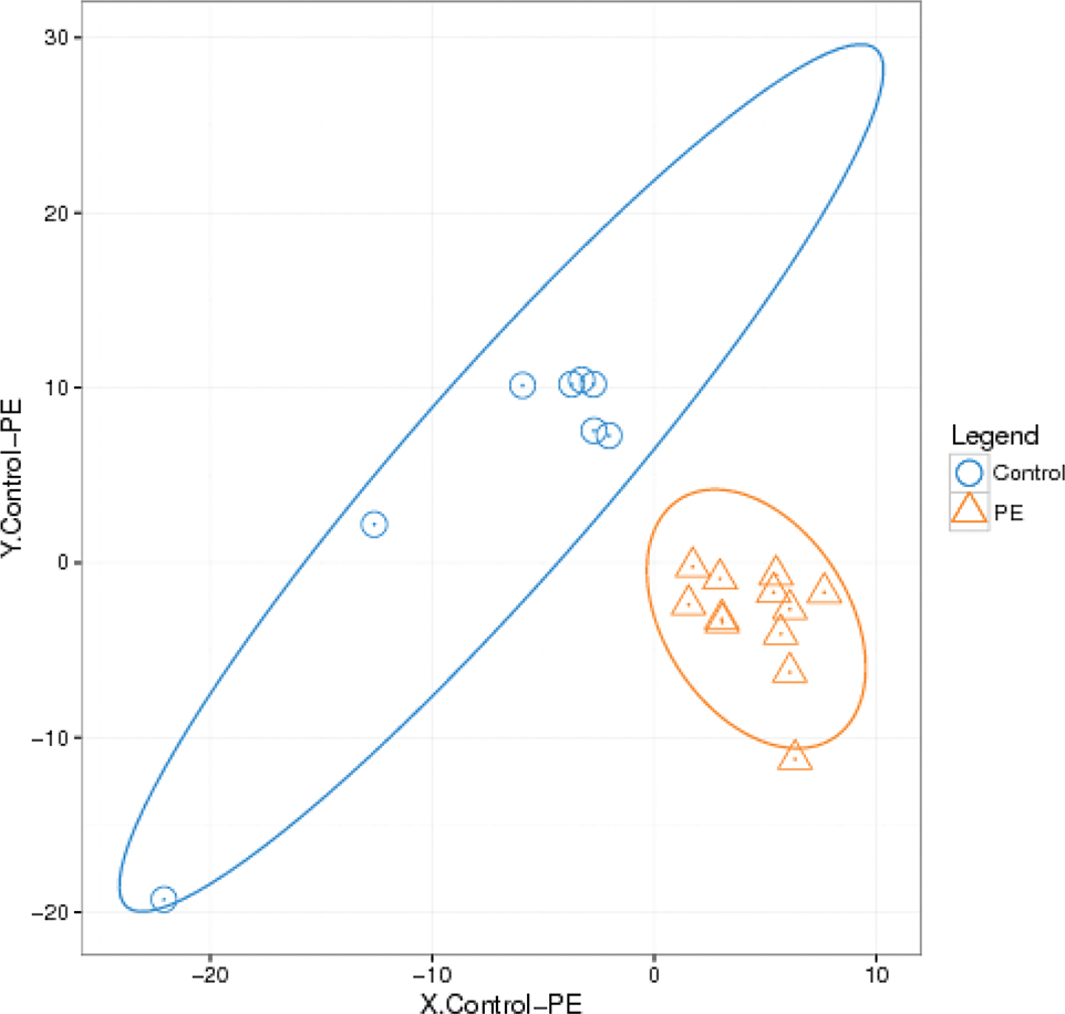 The results of β-diversity based on PLS-DA are shown in Fig. 1. Differences in GM communities between the two groups were documented. The distribution of samples from the PE group was more concentrated, whereas the distance between samples in the control group was longer. Hence, differences in the individual composition of GM were larger in the control group, and the similarities were smaller.