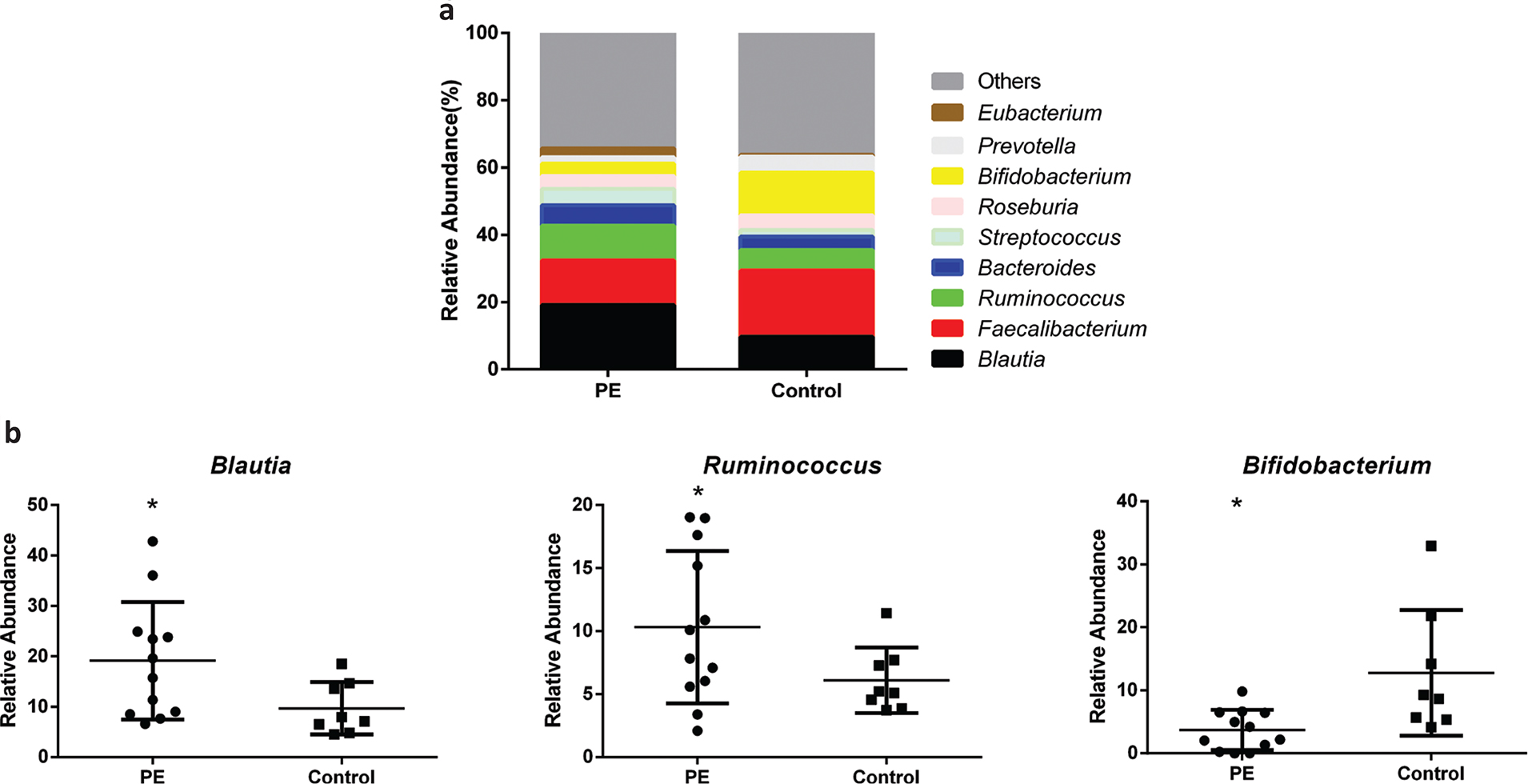 Conclusion: There is a potential for GM dysbiosis in PE patients, and they could be prone to suffer from metabolic syndrome. We speculate that alterations in the abundance of bacteria of certain genera (e.g. increased abundance of Blautia and Ruminococcus, and decreased abundance of Bifidobacterium) were associated with PE development to some degree. Our data could help to monitor the health of pregnant women and may be helpful for preventing and assisting treatment of PE by increasing dietary fiber or probiotics supplement.