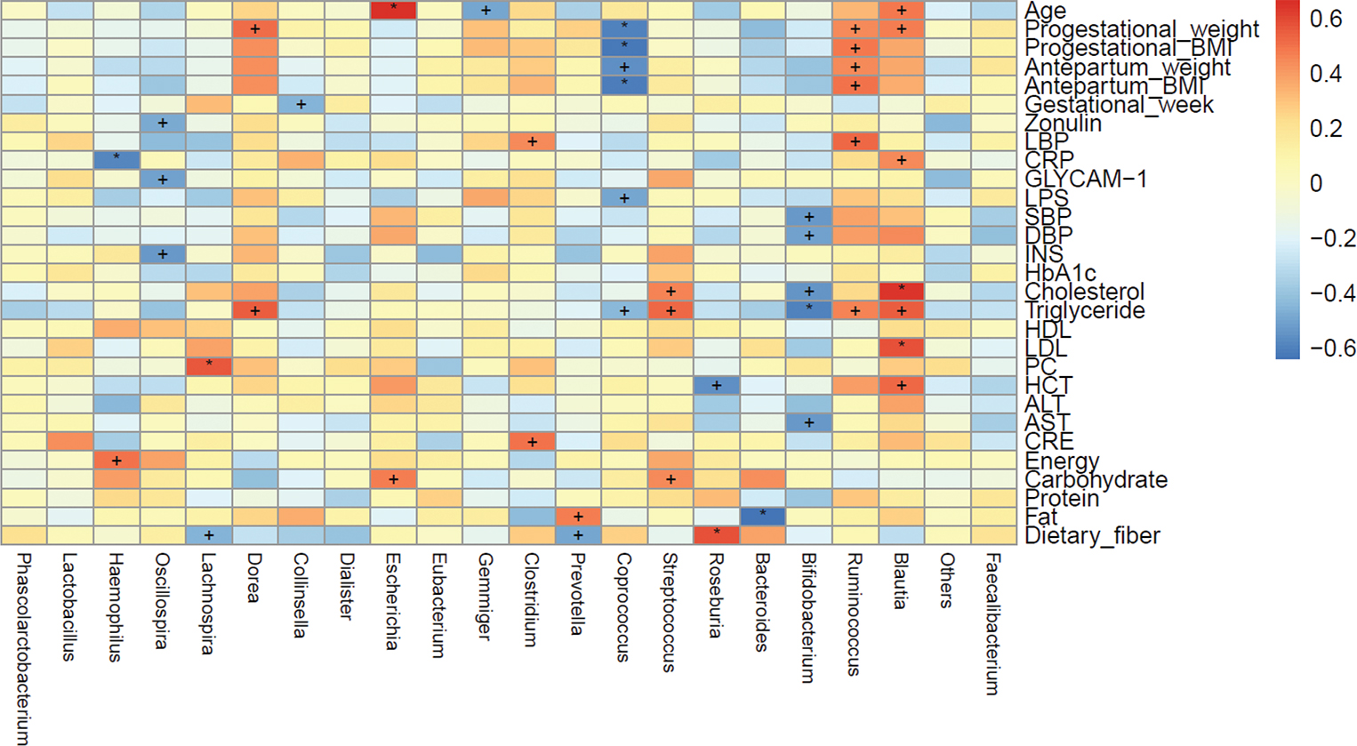 Fig. 6. The correlations between different maternal clinical parameters and gut microbiota genus in the two groups. Spearman’s rank correlation coefficients and P-values for the correlations are shown (‘+’: P<0.05; ‘*’: P<0.01). LBP: lipopolysaccharide-binding protein; CRP: C-reactive protein; GlyCAM-1: glycosylation cellular adhesion molecules; LPS: lipopolysaccharide; SBP: systolic blood pressure; DBP: diastolic blood pressure; INS: insulin; HbA1C: glycosylated haemoglobin; HDL: high-density lipoprotein; LDL: low-density lipoprotein; PC: platelet count; HCT: hematokrit; ALT: alanine transaminase; AST: aspartate transaminase; CRE: creatinine.