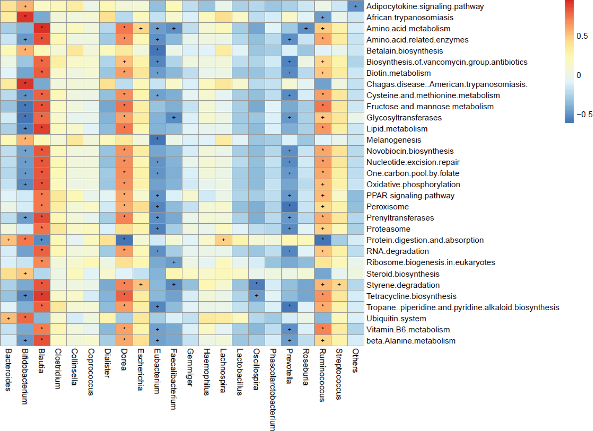 Fig. 7. The correlations between different functional modules and gut microbiota genus. Spearman’s rank correlation coefficients and P-values for the correlations are shown (‘+’: P < 0.05; ‘*’: P < 0.01).