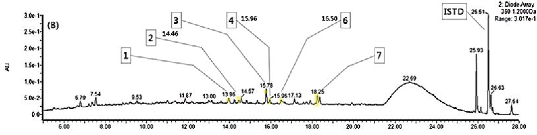 Fig. 1. The ultra-performance liquid chromatography (UPLC) chromatogram of flavonoids (detected at 350 nm) in high-pressure mulberry leaf extract. ISTD: internal standard, Peak 1: quercetin 3-O-rutinoside (rutin), Peak 2: quercetin 3-O-glucoside (isoquercitrin), Peak 3: quercetin 3-O-(6’’-O-malonyl)glucoside, Peak 4: kaempferol 3-O-rutinoside (nicotiflorin), Peak 5: quercetin 3-O-(2’’-O-malonyl)glucoside (morkotin), Peak 6: kaempferol 3-O-glucoside (astragalin), Peak 7: kaempferol 3-O-(6’’-O-malonyl)glucoside.