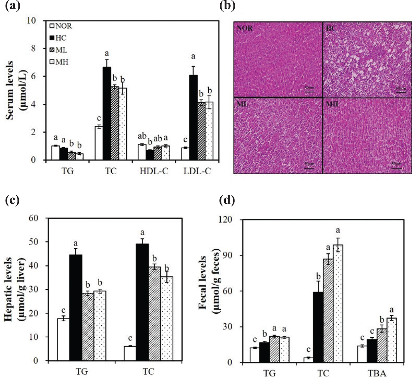 Fig. 2. Effects of the high hydrostatic pressure mulberry leaf extract on serum, hepatic and fecal lipid profiles. (a) Serum lipid profiles. LDL-C = TC − HDL-C − (TG/5). (b) Representative hematoxylin and eosin (H&E)-stained liver sections (scale bars, 50 μm; magnification, 400X). (c) Hepatic lipid profiles. (d) Fecal lipid profiles together with bile acid levels. Values are expressed as mean ± SEM (n = 10). Bars with different letters (a, b, c) show significant differences (P < 0.05). HDL-C, HDL-cholesterol; LDL-C, LDL-cholesterol; TBA, total bile acid; TC, total cholesterol; TG, triglyceride. NOR, normal diet; HC, high-cholesterol diet containing 1% cholesterol and 0.5% cholic acid; ML, HC + 0.5% high hydrostatic pressure mulberry leaf extract; MH, HC + 1% high hydrostatic pressure mulberry leaf extract.