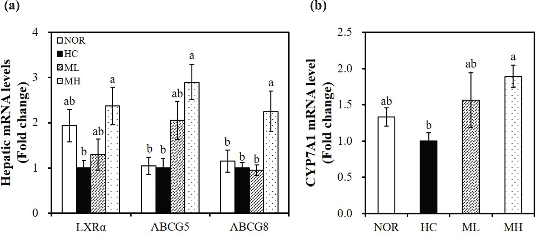 Fig. 3. Effects of the high hydrostatic pressure mulberry leaf extract on the expression of hepatic genes related to cholesterol efflux. The mRNA levels of LXRα, ABCG5 and ABCG8 (a), and CYP7A1 (b) were measured by real-time qPCR and normalized to β-actin. The results are expressed as the fold change as compared with the HC group. Values are expressed as mean ± SEM (n = 10). Bars with different letters (a, b) show significant difference (P < 0.05). NOR, normal diet; HC, high-cholesterol diet containing 1% cholesterol and 0.5% cholic acid; ML, HC + 0.5% high hydrostatic pressure mulberry leaf extract; MH, HC + 1% high hydrostatic pressure mulberry leaf extract.