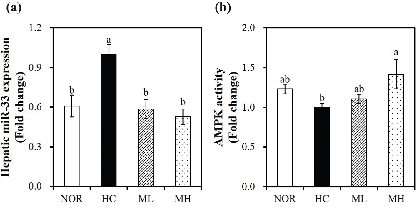 Fig. 4. Effects of the high hydrostatic pressure mulberry leaf extract on microRNA (miR)-33 and AMPK activity in the liver. (a) miR-33 expression was analyzed using real-time qPCR, normalized for all samples to U6 snRNA, and expressed as the fold change compared with the HC group. (b) AMPK activity was measured using an AMPK kinase kit, normalized to their relative protein contents, and expressed as the fold change compared with the HC group. Values are expressed as mean ± SEM (n = 10/group). Bars with different letters (a, b) show significant difference (P < 0.05). NOR, normal diet; HC, high-cholesterol diet contained 1% cholesterol and 0.5% cholic acid; ML, HC + 0.5% high hydrostatic pressure mulberry leaf extract; MH, HC + 1% high hydrostatic pressure mulberry leaf extract.