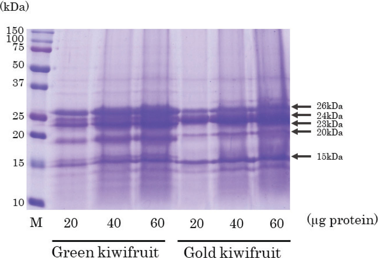 The protein content in green kiwifruit and gold kiwifruit was confirmed by CBB staining after SDS-PAGE, and the patterns of protein bands between the two species were generally similar, although there were slight differences (Fig. 1). The major protein bands in these two species included 26, 24, 23, 20, and 15 kDa bands.