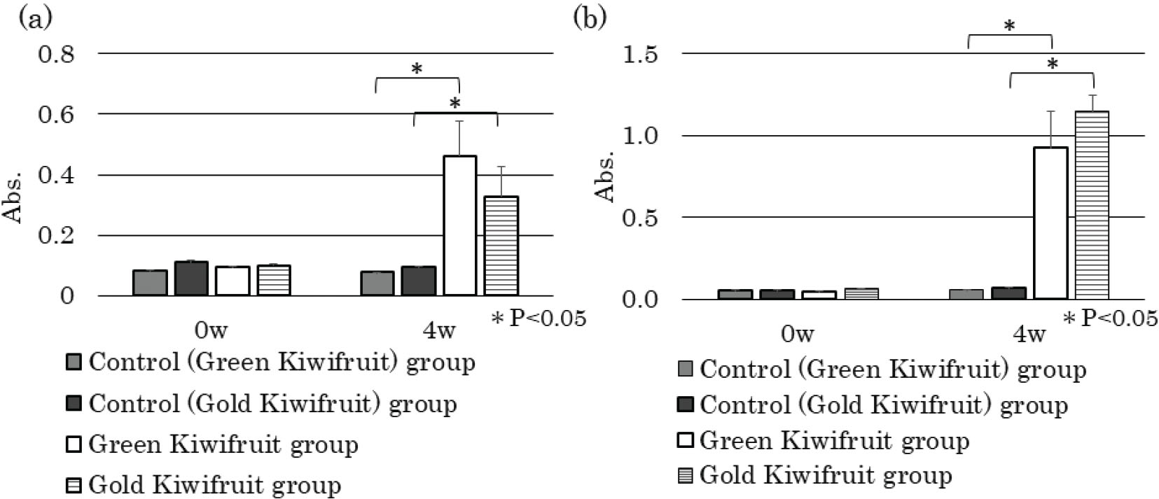 Fig. 3. Effect of percutaneous sensitization with kiwifruit extracts on kiwifruit-specific antibody levels in mice sera. Kiwifruit protein-specific IgE levels (a) and IgG1 levels (b) in control and kiwifruit groups at 0 and 4 weeks were determined using ELISA performed with each kiwifruit protein coated plates. Sera from the control group were measured two-way, one by using green kiwifruit as a solid-phase (Control (Green Kiwifruit)) and the other by using gold kiwifruit as a solid-phase (Control (Gold Kiwifruit)). Absorbance data are expressed as means ± standard deviations; control group (n = 5), green kiwifruit group (n = 6), gold kiwifruit group (n = 5). *P < 0.05.