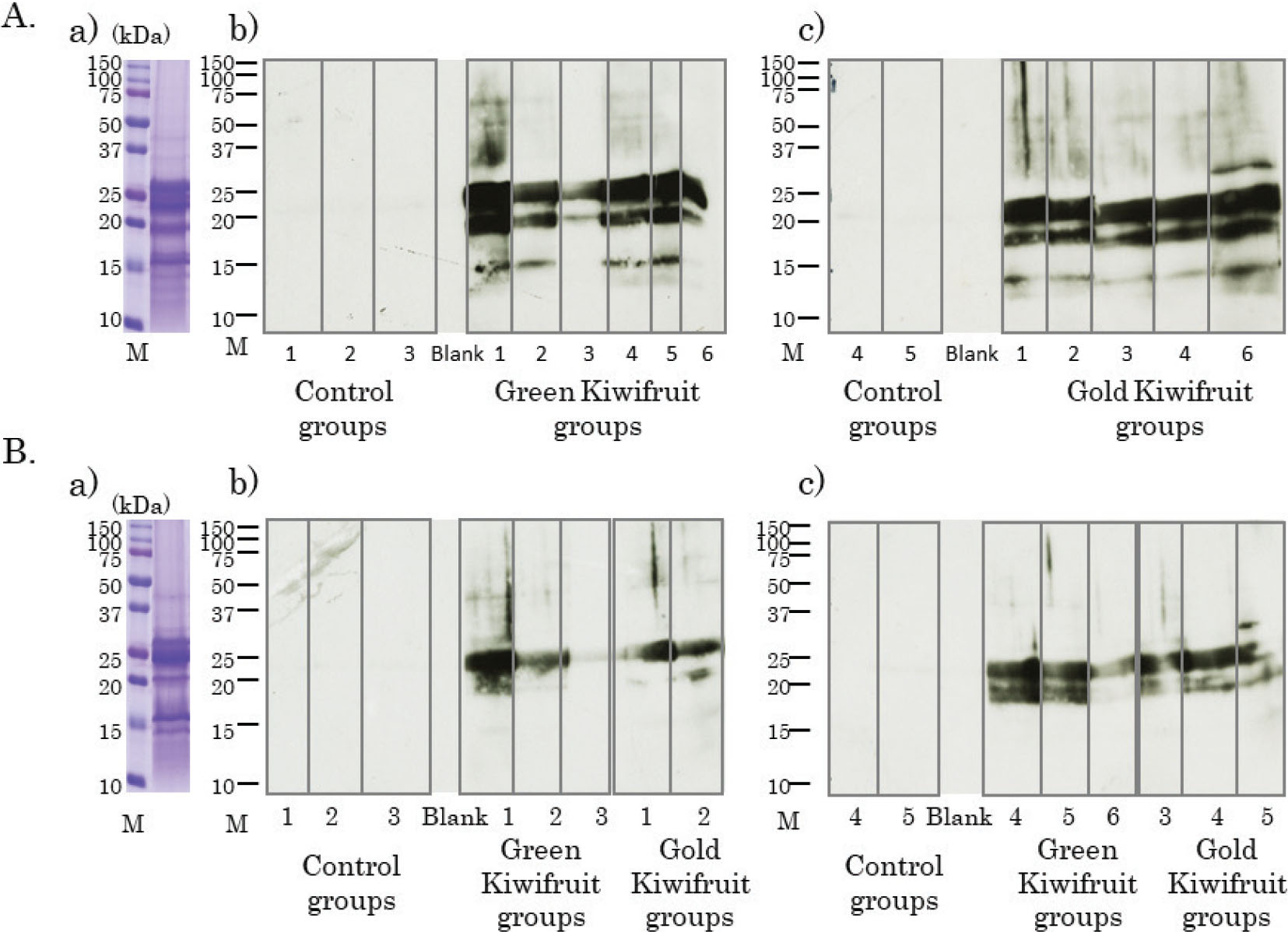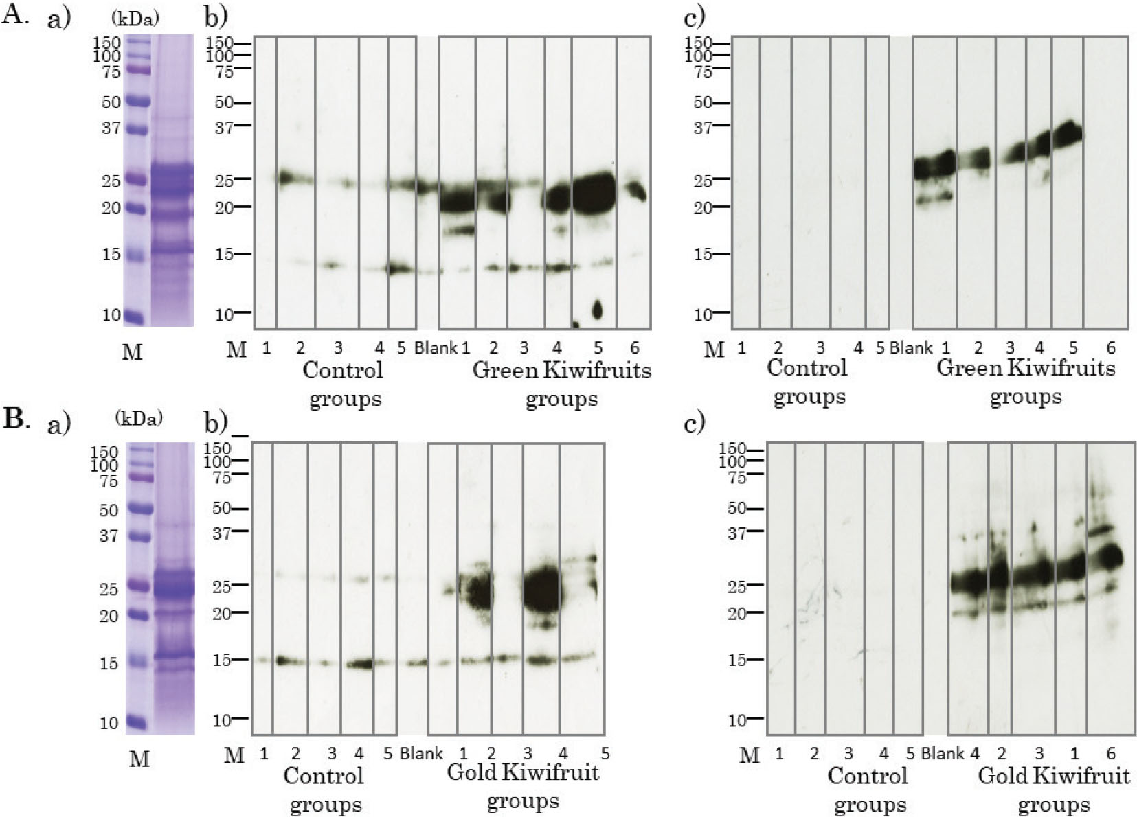 Fig. 6. Confirmation of cross-reactions between two species of kiwifruit using immunoblotting. (A) Coomassie brilliant blue staining of green kiwifruit proteins (a). The numbers indicate the individual mice in control and each of kiwifruit groups. Immunoblotting using green kiwifruit proteins, individual mice sera, and horseradish peroxidase (HRP)-labeled anti-mouse IgG1 antibody (b, c). (B) The numbers indicate the individual mice in control and each of kiwifruit groups. Coomassie brilliant blue staining of gold kiwifruit proteins (a). Immunoblotting using gold kiwifruit proteins, individual mice sera, and HRP-labeled anti-mouse IgG1 antibody (b, c).