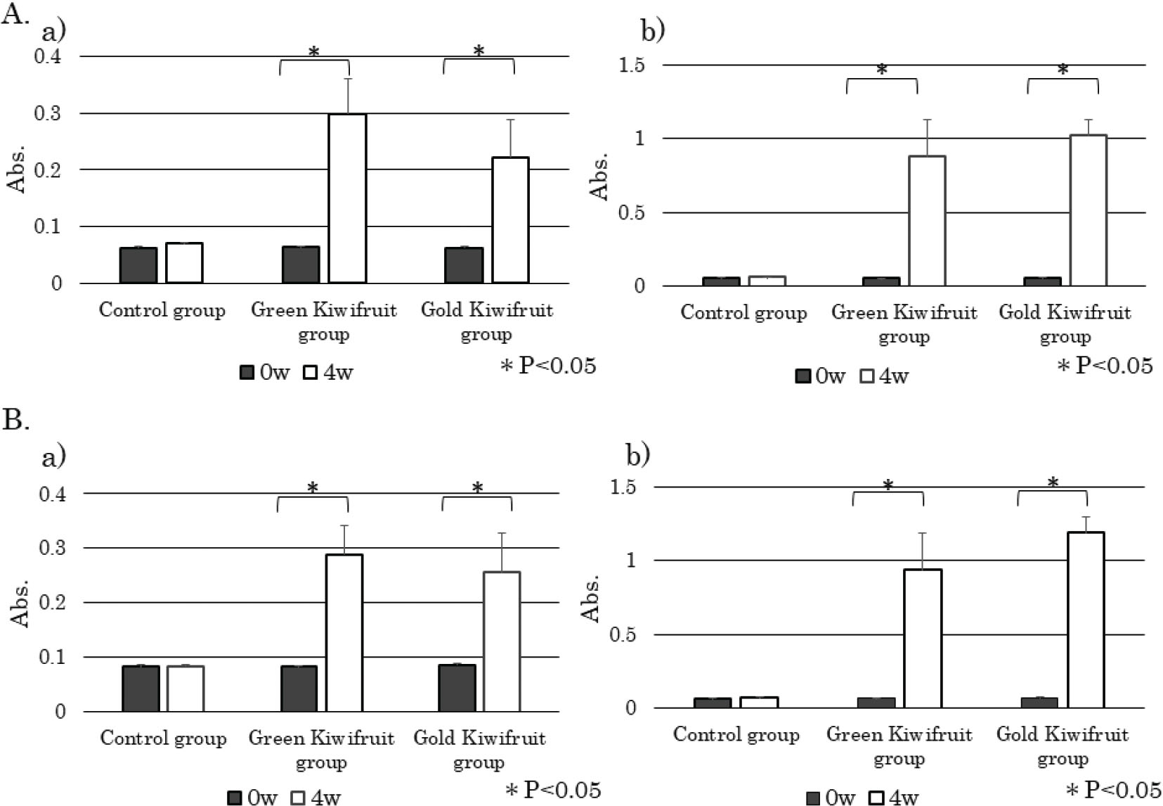 Fig. 5. Confirmation of cross-reactions between two species of kiwifruit. (A) The serum IgE (a) and IgG1 levels (b) in control and kiwifruit groups at 0 and 4 weeks were determined using enzyme-linked immunosorbent assay (ELISA) performed with green kiwifruit protein-coated plates. (B) Serum IgE levels (a) and IgG1 levels (b) in control and kiwifruit groups at 0 and 4 weeks were determined using ELISA performed with gold kiwifruit protein-coated plates. Absorbance data are expressed as means ± standard deviations; control group (n = 5), green kiwifruit group (n = 6), gold kiwifruit group (n = 5). *P < 0.05.