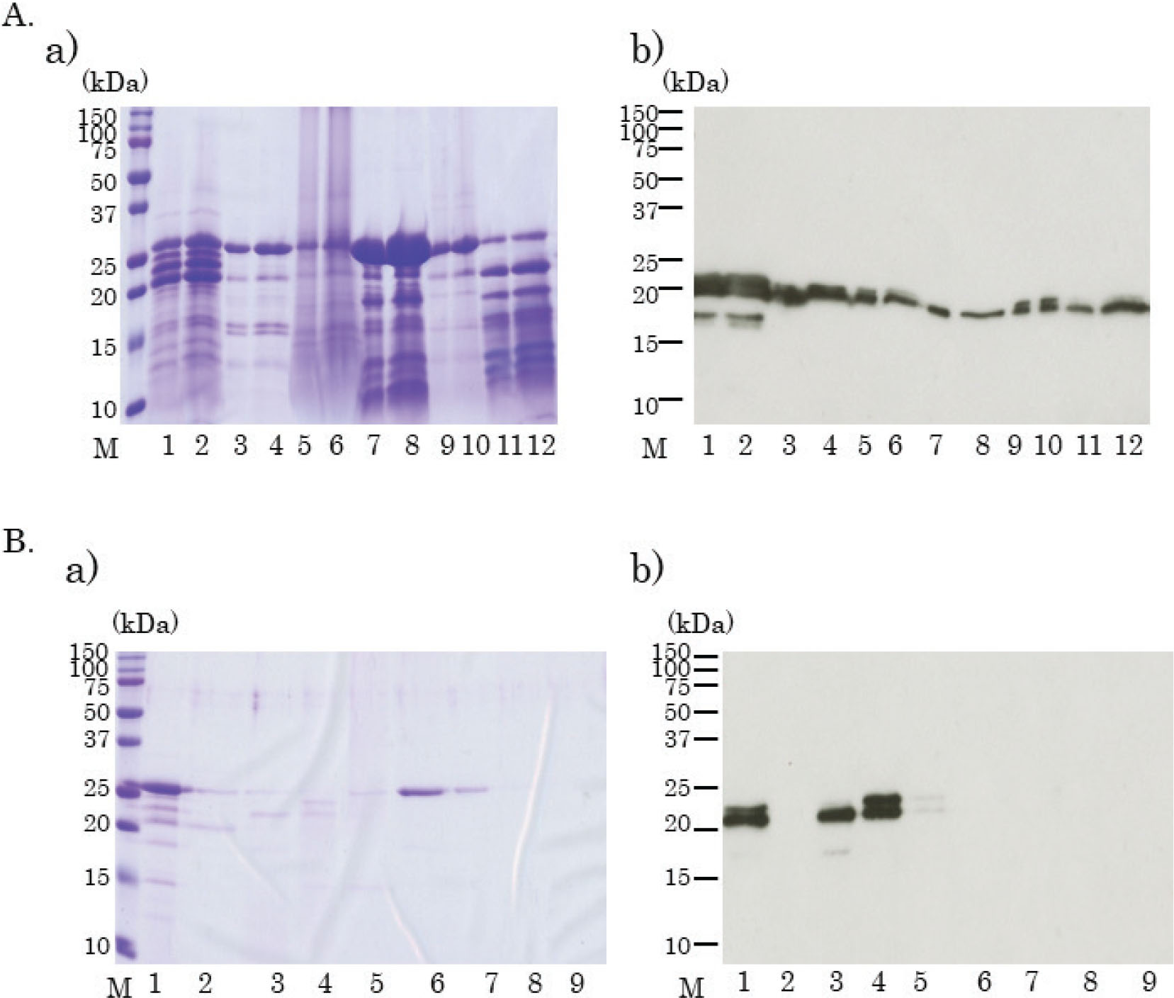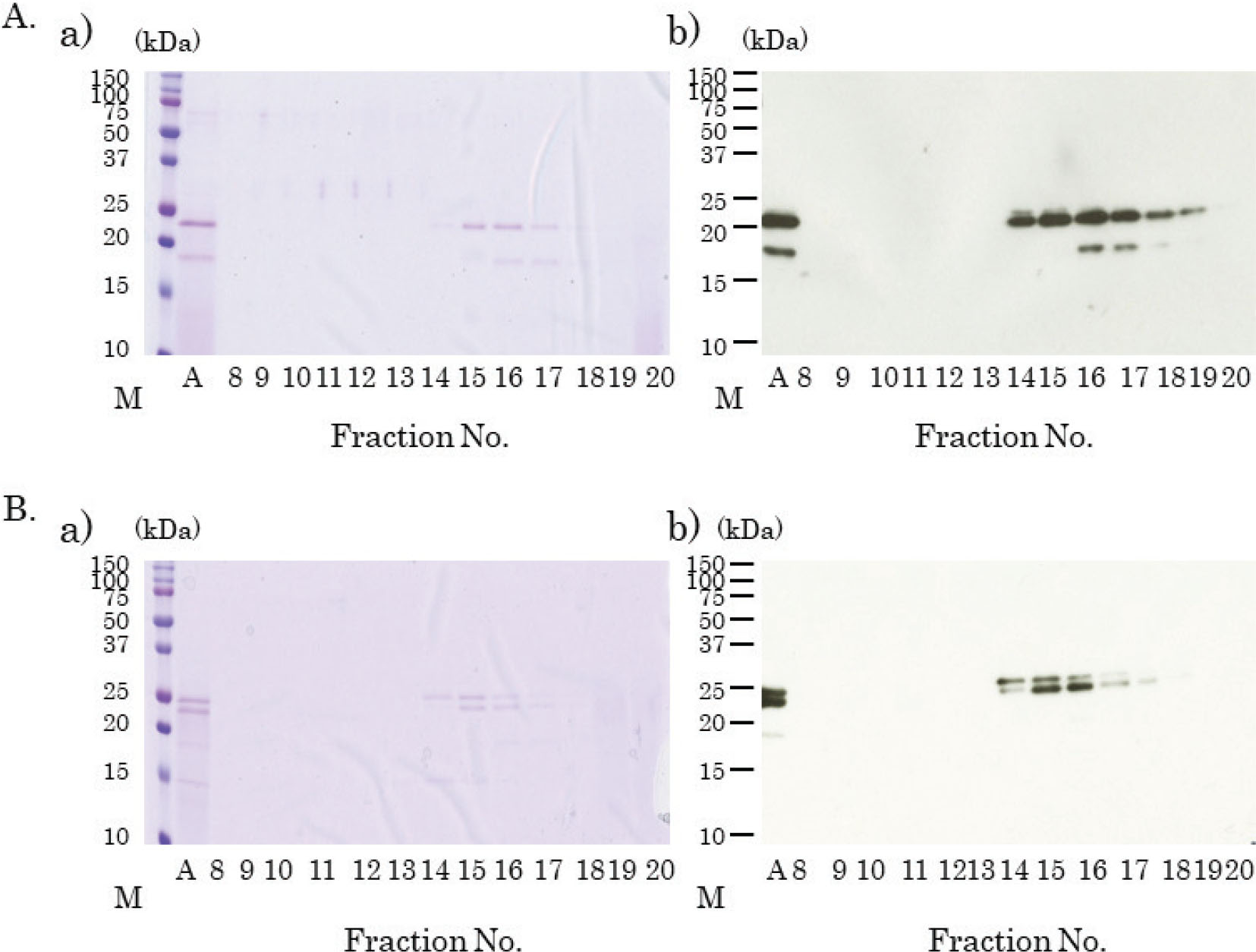Fig. 8. Separation of kiwifruit proteins using gel-filtration high-pressure liquid chromatography (HPLC). Coomassie brilliant blue staining of separated kiwifruit proteins (A(a), B(a)). Immunoblotting using fractionated kiwifruit proteins, mice sera, and horseradish peroxidase-labeled anti-mouse IgG1 antibody (A(b), B(b)). (A) Ion-exchanged 0.05 M NaCl eluted samples with 0–20% ammonium sulfate precipitation, were collected and fractionated on gel-filtration HPLC columns after concentration. Lane A: concentrated sample; Lanes 8~20: eluted fraction number, respectively. (B) Ion-exchanged 0.1 M NaCl eluted samples with 0–20% ammonium sulfate precipitation were collected and fractionated on gel-filtration HPLC columns after concentration. Lane A: concentrated sample; Lanes 8~20: eluted fraction number, respectively.