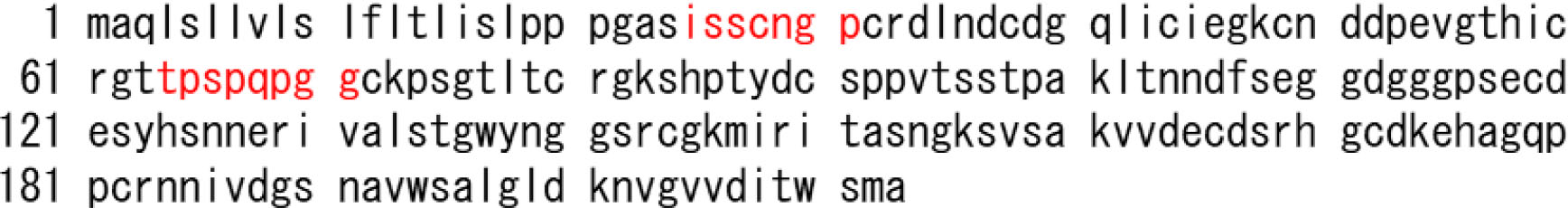Fractions eluted from gel-filtration columns were transferred to PVDF membranes, and Edman degradation analysis was performed to identify these protein bands. The N-terminal sequences of 23 kDa and 24 kDa proteins were found to be ‘TCSPQPGG’, whereas the N-terminal amino acid sequence of the protein of 18 kDa molecular weight was ‘ISSCNGPP’. A homology search using BLAST for proteins with matched N-terminal sequences was performed, and all the three samples matched with the N-terminal proximal sequence of kiwellin (Act d 5), a cysteine-rich cell wall-related protein (Fig. 9).