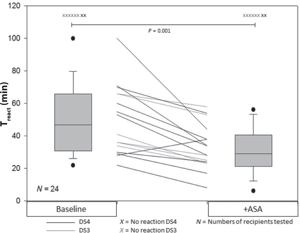 Fig. 1. Reaction time without cofactors and with ASA. Pooled data from DS3 and DS4. Reaction time after ingestion of 132 g egg white measured as Treact without adding cofactors and with additional ingestion of ASA. The boxplots represent paired pooled data from DS3 and DS4 and each line represents one recipient. ASA, acetylsalicylic acid; DS#, Donor Serum number.