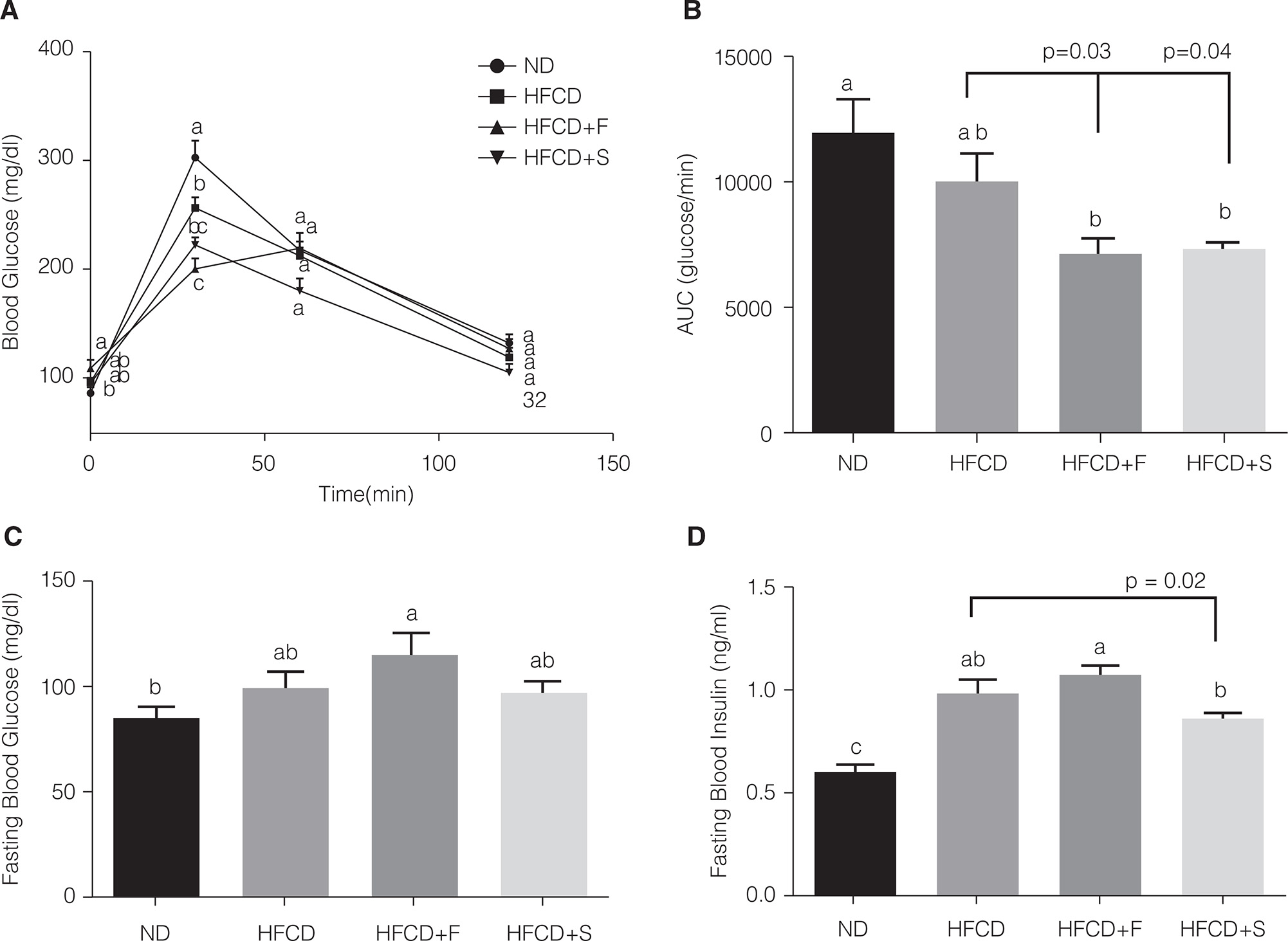 Fig. 1. Effects of broccoli intake on glucose homeostasis. Male C57BL/6J mice were fed with normal diet (ND), high-fat cholesterol diet (HFCD), high-fat cholesterol diet + 15% broccoli florets (HFCD+F), high-fat cholesterol diet + 15% broccoli stalks (HFCD+S) for 7 weeks. An oral glucose tolerance test for 120 min was performed at week 5 (A). Glucose tolerance test was measured as the area under the curve (AUC) (B). Mean fasting blood glucose concentration at sacrifice (C) and insulin serum levels at sacrifice (D). Values are expressed as mean ± SEM (n = 7–8). Means without a common letter are statistically different (P < 0.05).