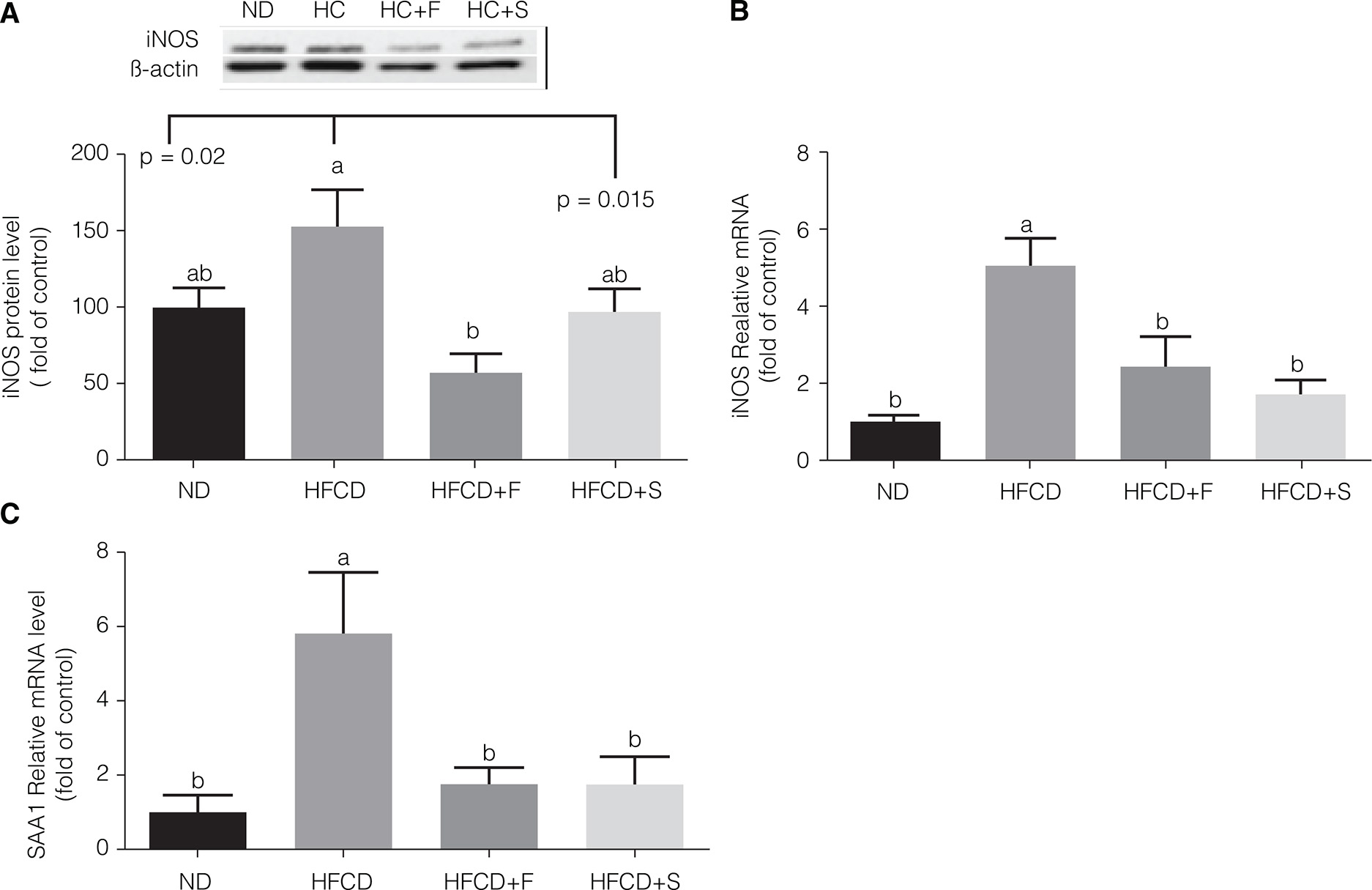 Fig. 3. Effects of broccoli supplementation on inflammatory markers in the liver. Male C57BL/6J mice were fed with normal diet (ND), high-fat cholesterol diet (HFCD), high-fat cholesterol diet + 15% broccoli florets (HFCD+F), high-fat cholesterol diet + 15% broccoli stalks (HFCD+S) for 7 weeks. Protein and gene expressions of iNOS (A+B) and SAA1 gene (C) were examined. Values are expressed as mean ± SEM. Means without a common letter are statistically different (P < 0.05).