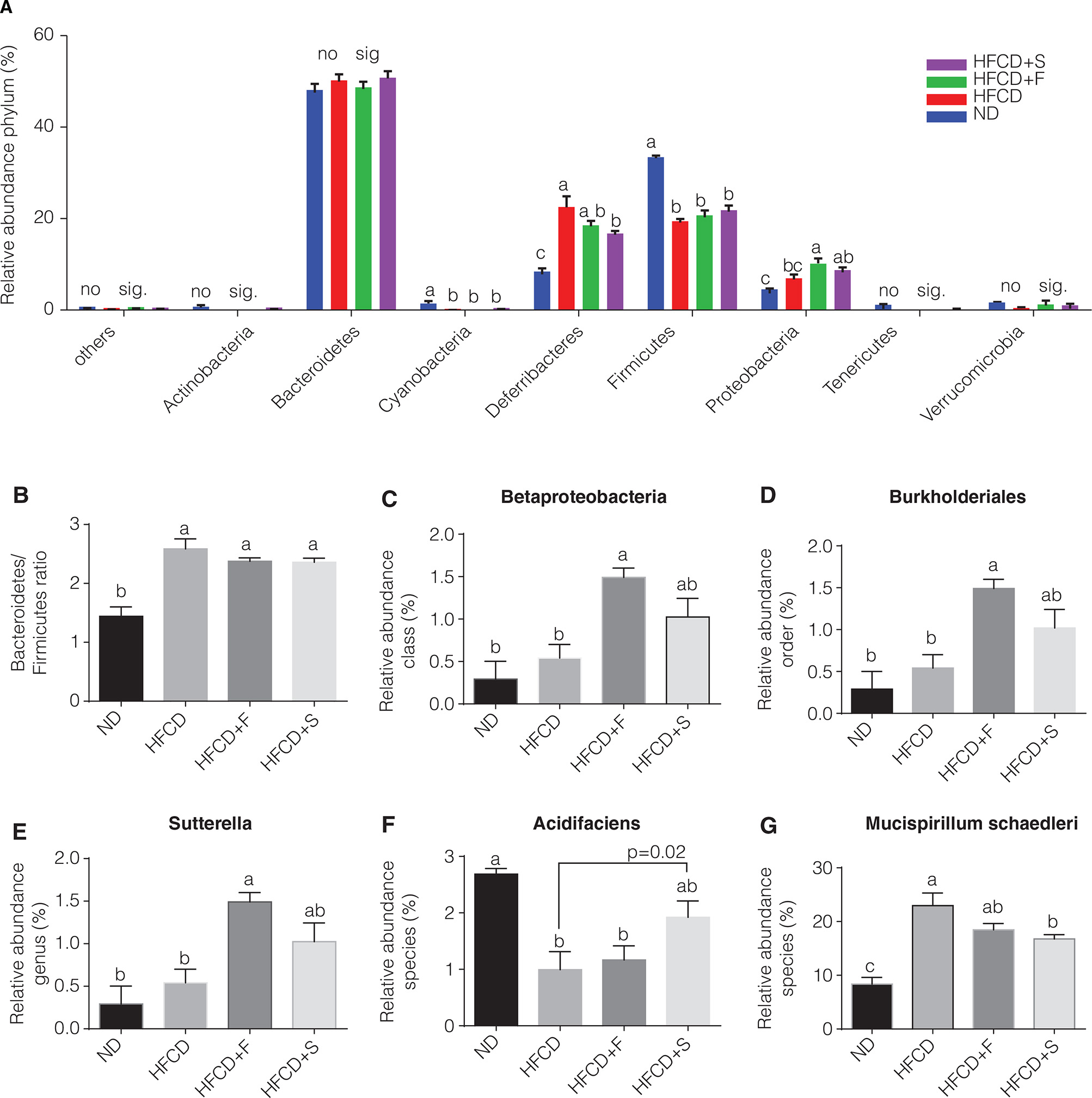 Microbiota composition was comprehensively characterized at all taxonomic levels. At the phylum level, Firmicutes and Cyanobacteria abundances were lower in all HFCD groups compared with the ND group (Fig. 4A). Deferribacteres abundance was markedly attenuated by broccoli stalks added to HFCD (Fig. 5A). Proteobacteria abundance was significantly raised in the group supplemented with broccoli florets compared with HFCD and ND groups (Fig. 4A). The Bacteroidetes/Firmicutes ratio was decreased in the ND group compared with all HFCD groups (Fig. 4B). At the class level, Betaproteobacteria abundance was significantly elevated in mice fed with broccoli florets compared with HFCD and ND groups (Fig. 4C). At the order level, Burkholederiales abundance was significantly increased in the HFCD+F group (Fig. 4D). At the genus level, a significant increase in Sutterella abundance was observed in the florets-supplemented group (Fig. 4E). At the species level, a decrease in the abundance of Mucispirillum schaedleri was registered in the HFCD+S group compared with the HFCD group, while the Acidifaciens community was elevated compared with the HFCD group (Fig. 4F, G).