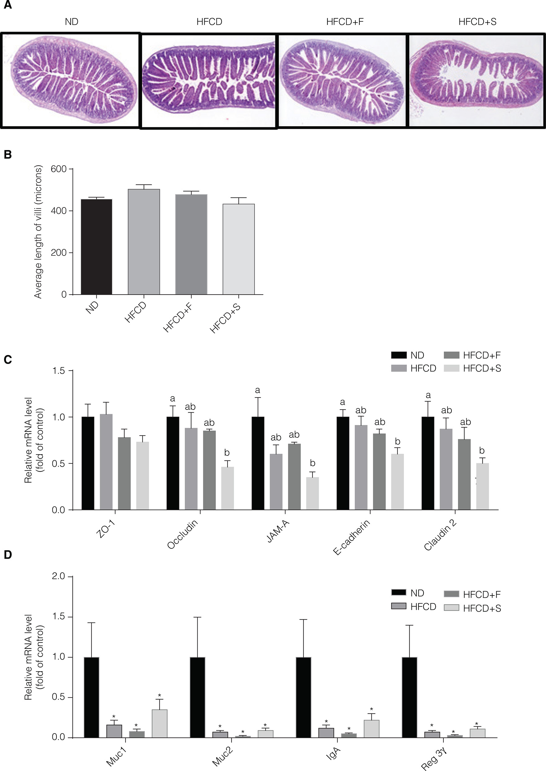 Fig. 5. The effect of broccoli supplementation on colon histology and genes related to intestinal barrier integrity. Male C57BL/6J mice were fed with normal diet (ND), high-fat cholesterol diet (HFD), high-fat cholesterol diet + 15% broccoli florets (HFCD+F), high-fat cholesterol diet + 15% broccoli stalks (HFCD+S) for 7 weeks. Colon histology (A), colon crypt length (the length of 3 villi was measured in each section) (B), and genes related to intestinal barrier integrity (C + D). Values are expressed as mean ± SEM (n = 5). Means without a common letter are statistically different (P < 0.05). *Versus ND group.