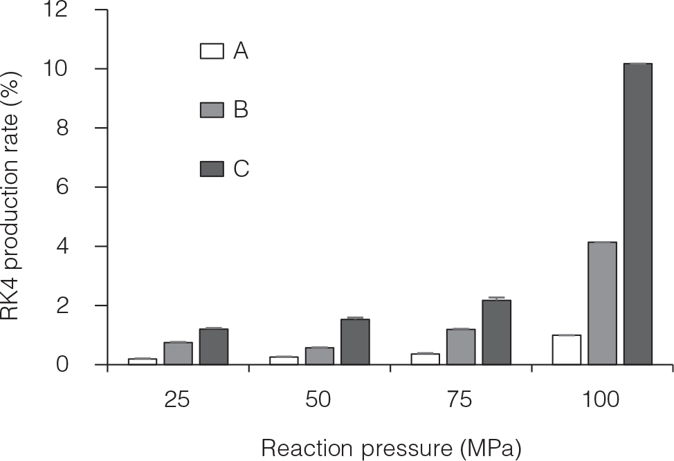 As presented in Fig. 2, the RK4 production rate under pressure conditions of 75 MPa or lower was small, and difference in the production rate between the reaction solutions A, B, and C was <2%. However, a high production rate was confirmed in reaction solutions B and C at 100 MPa. Compared to the production rate under the condition of 75 MPa or less, the rate of reaction solution B was approximately twice as fast, and the rate of solution C was four or more times faster. In particular, reaction solution C at 100 MPa exhibited a remarkably high reaction rate of 10.2%, suggesting a strong relationship between production efficiency and reaction conditions such as pressure and substrate concentration. This result suggested that a high-pressure condition of 100 MPa is effective for the production of RK4.
