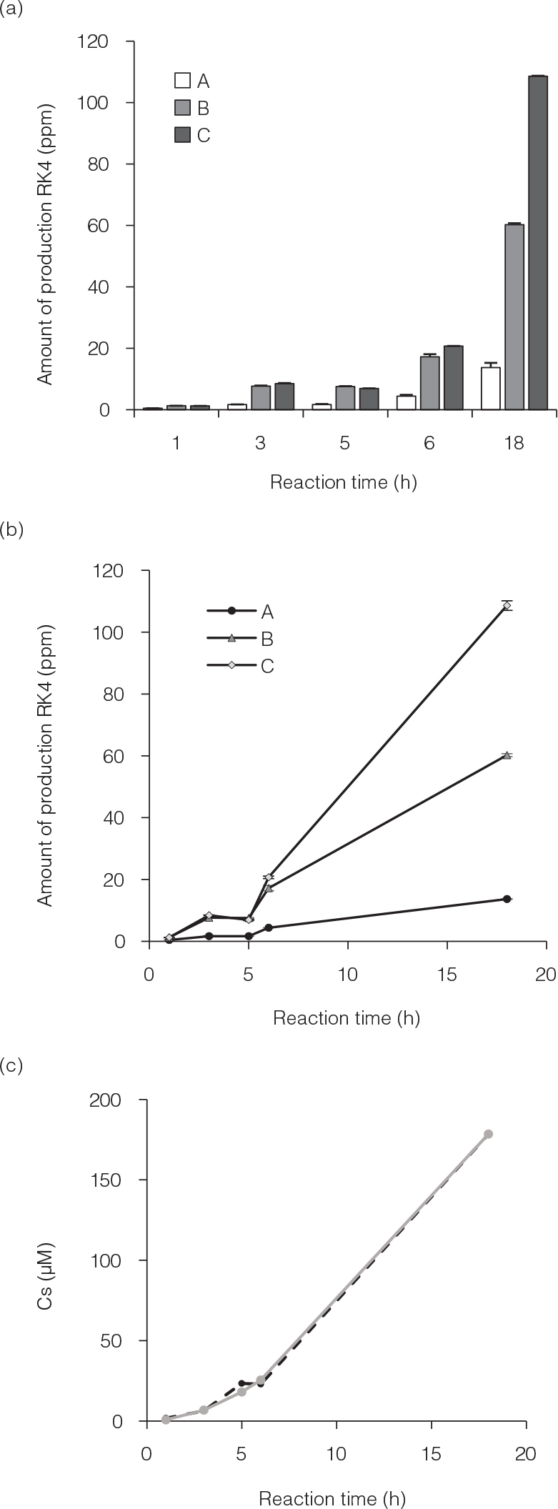 Fig. 3. Amounts of RK4 produced after various reaction times. (a) and (b) A solution of caffeic acid and resveratrol was reacted at 100 MPa and 90 ºC for 1–18 h to generate and subsequently quantify the amount of RK4. Quantitative results are shown as the amount produced (ppm). The substrate concentrations were different among A, B, and C. The substrate content of each solution was as follows. Solution A: caffeic acid 0.024 g, resveratrol 0.012 g; solution B: caffeic acid 0.12 g, resveratrol 0.06 g; solution C: caffeic acid 0.6 g, resveratrol 0.3 g. Values are expressed as means ± SD (n = 3). (c) A graph edited to identify rate coefficients. The dotted line represents measured values, and the solid line is the simulated graph from which the rate coefficients were calculated.