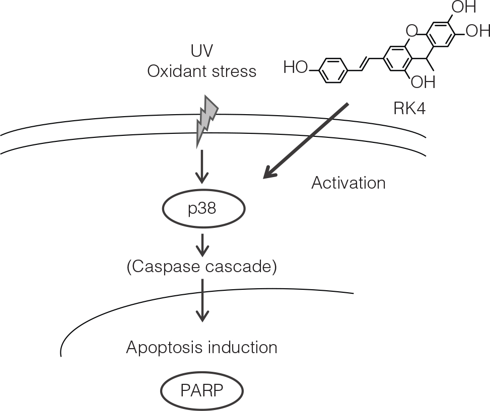 The IC50 values were 23.6 µM for RK4 and 145.3 µM for resveratrol. These values indicated that RK4 exerts greater growth inhibitory effects on HeLa cells than resveratrol, and our results strongly suggested its potential as a functional food component. Western blotting analysis revealed that RK4 strongly induced p38 activation. In addition, there was no activation of p38 by resveratrol. These results suggested that RK4 may induce stress-responsive apoptosis in HeLa cells. In addition, it was shown that RK4 induced the cleavage of PARP, and this result supported the effect of RK4 in inducing apoptosis in HeLa cells. A schematic diagram of a proposed pathway by which RK4 acts on cancer cells is presented in Fig. 6. This study showed that RK4 is a more potent inducer of apoptosis than that of resveratrol, and further supports the idea that it represents a promising candidate for an antitumor agent. However, since only a small number of protein markers of apoptotic induction were successfully detected in this study compared with previous reports, it will be necessary to investigate other such apoptotic markers in order to further elucidate the mechanisms of action of RK4.