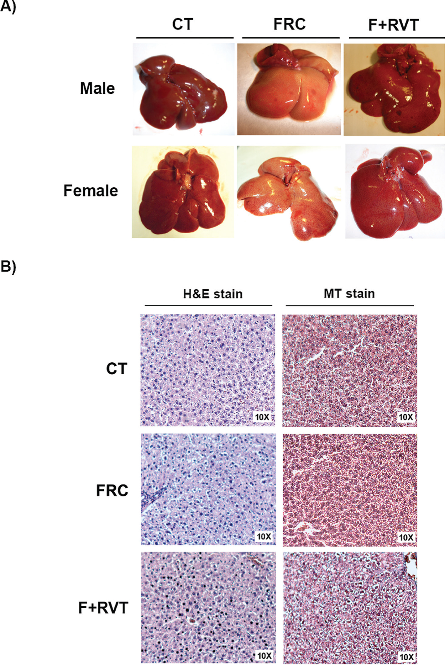 Fig. 3. De visu (CT, control; FRC, fructose; F+RVT, fructose plus resveratrol) and histological analysis of livers from Sprague–Dawley rats corresponding to the different study groups. (A) Representative pictures of livers from male and female rats and (B) haematoxylin–eosin (10×) and Trichromic Masson (10×) representative stained liver samples of Sprague–Dawley female rats.
