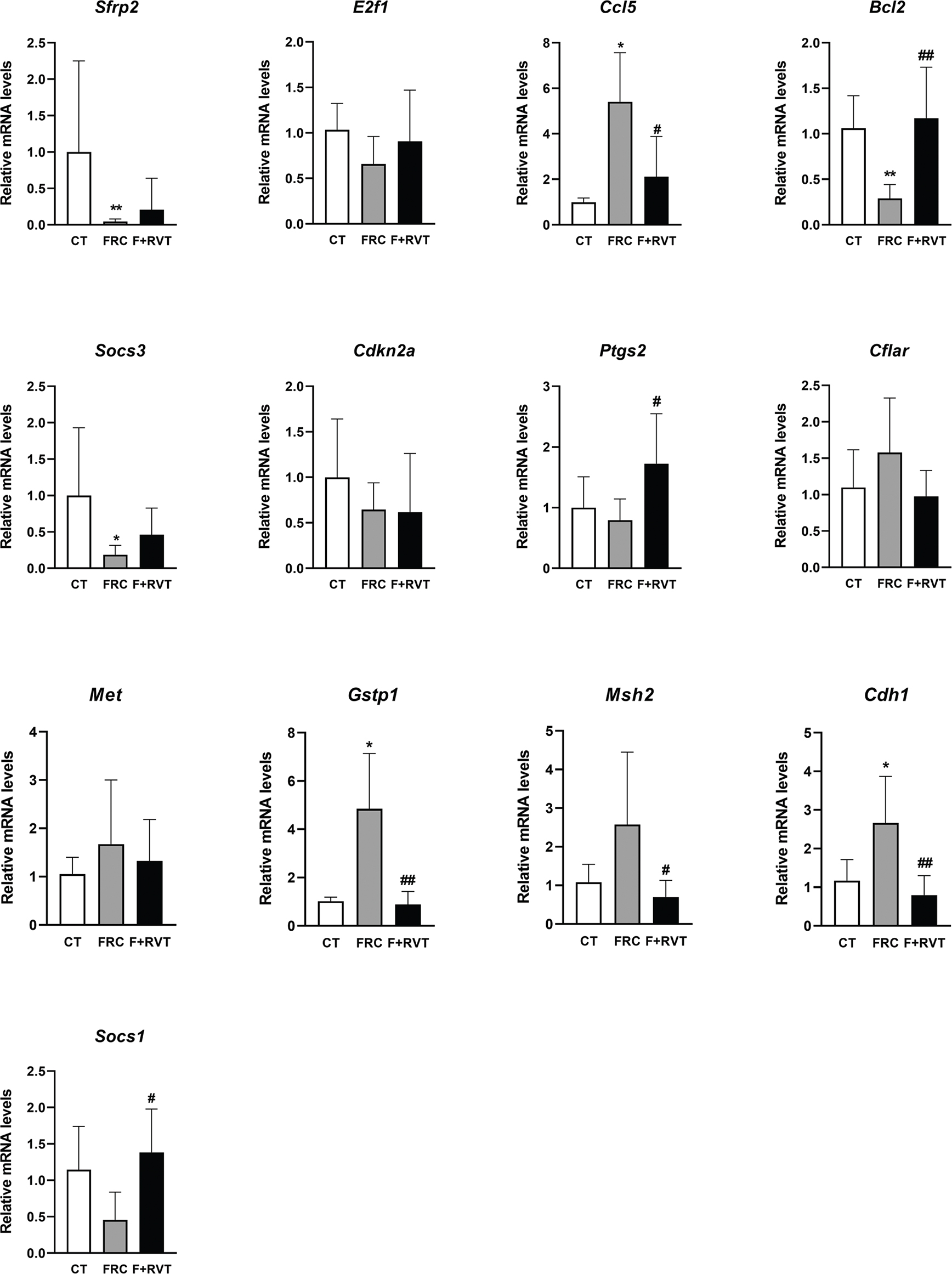 Fig. 5. Validation of a representative subset of mRNAs involved in the main molecular pathways associated with metabolic response after chronic fructose in livers of female Sprague–Dawley rats. Relative liver expression of secreted frizzled-related protein 2 (Sfrp2), e2f transcription factor 1 (E2f1), c-c motif chemokine ligand 5 (Ccl5), B-cell lymphoma 2 (Bcl2), suppressor of cytokine signalling 3 (Socs3), cyclin-dependent kinase inhibitor 2A (Cdkn2a), prostaglandin-endoperoxidase synthase 2 (Ptgs2), CASP8- and FADD-like apoptosis regulator (Cflar), met proto-oncogene receptor tyrosine kinase (Met), glutathione s-transferase Pi1 (Gstp1), mutS homolog 2 (Msh2), cadherin 1 (Cdh1) and suppressor of cytokine signalling 1 (Socs1) in samples from the different study groups (CT, control; FRC, fructose; F+RVT, fructose plus resveratrol). Gene expression levels were determined by real-time PCR. Each bar represents the mean ± standard deviation (SD) (n = 6–8 for each group). *P < 0.05, **P < 0.01 versus control; #P < 0.05, ##P < 0.01 versus FRC.