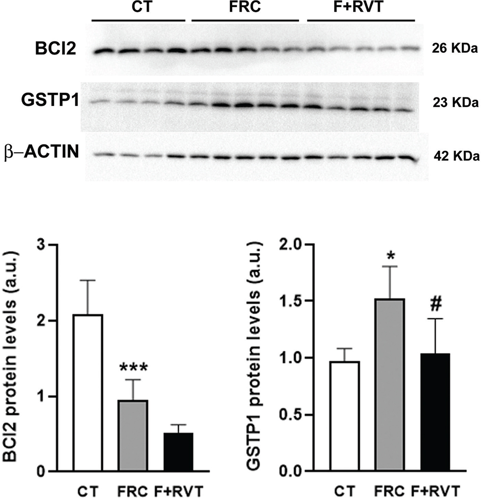 Fig. 6. Western-blot (WB) analysis of B-cell lymphoma 2 (BCL2) and glutathione s-transferase Pi1 (GSTP1) proteins in female Sprague–Dawley rat liver samples from the different study groups (CT, control; FRC, fructose; F+RVT, fructose plus resveratrol). Bar plots show the relative WB band intensity as mean ± SD of 4–5 different liver samples. At the upper part of the figure, actual WB bands corresponding to the three different study groups are shown.
