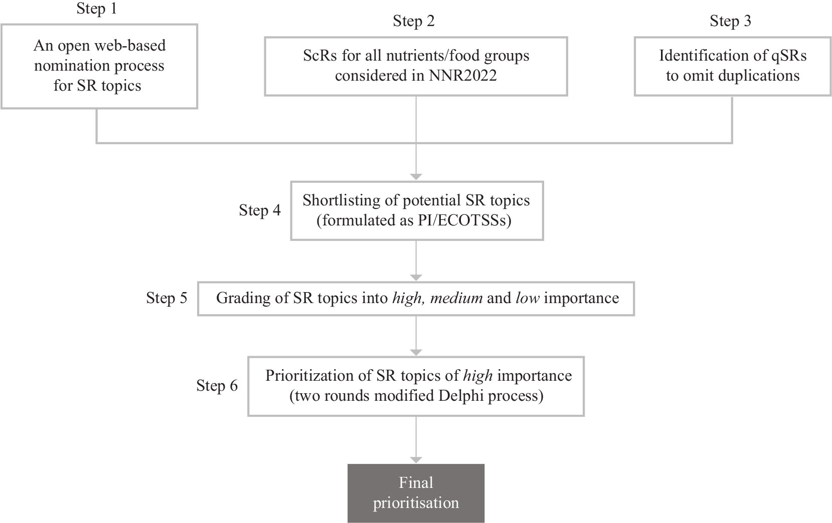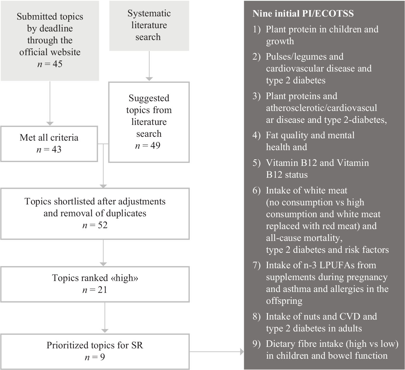 Results: A total of 45 nominations with suggestion for more than 200 exposure–outcome pairs were received in the public call. A number of additional topics were identified in ScRs. In order to omit duplication with recently qualified SRs, we defined criteria and identified 76 qualified SRs. The NNR2022 Committee subsequently shortlisted 52 PI/ECOTSS statements, none of which overlapped with the qualified SRs. The PI/ECOTSS statements were then graded ‘High’ (n = 21), ‘Medium’ (n = 9) or ‘Low’ (n = 22) importance, and the PI/ECOTSS statements with ‘High’ were ranked in a Delphi process. The nine top prioritised PI/ECOTSS included the following exposure–outcome pairs: 1) plant protein intake in children and body growth, 2) pulses/legumes intake, and cardiovascular disease and type 2 diabetes, 3) plant protein intake in adults, and atherosclerotic/cardiovascular disease and type 2 diabetes, 4) fat quality and mental health, 5) vitamin B12 and vitamin B12 status, 6) intake of white meat (no consumption vs. high consumption and white meat replaced with red meat), and all-cause mortality, type 2 diabetes and risk factors, 7) intake of n-3 LPUFAs from supplements during pregnancy, and asthma and allergies in the offspring, 8) nuts intake and cardiovascular disease (CVD) and type 2 diabetes in adults, 9) dietary fibre intake (high vs. low) in children and bowel function.
