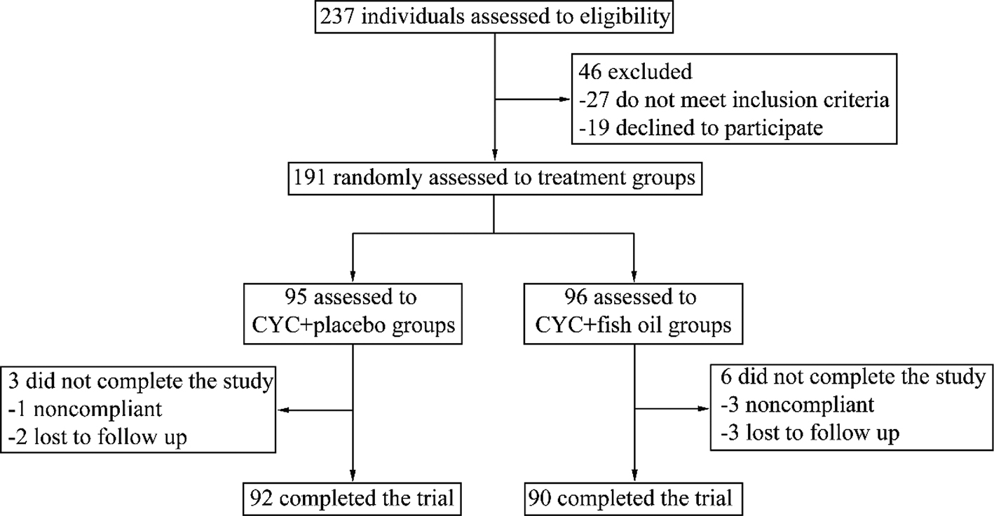 A total of 237 LN patients were recruited, and 46 of them were excluded. The 191 eligible participants were randomized into 2 groups: cyclophosphamide + placebo group (n = 95) and cyclophosphamide + fish oil group (n = 96). Ninety-two participants in the cyclophosphamide + placebo group and 90 participants in the cyclophosphamide + fish oil group completed the trial. Nine patients did not complete this study (three in the control group and six in the fish oil group), and they were deemed as treatment failure in the intention-to-treat analysis. The research framework of this study was shown in Fig. 1. Demographic data and baseline characteristics of participants were recorded. Researchers involved in the recruitment, data collection, and analyses were blind to group assignment.