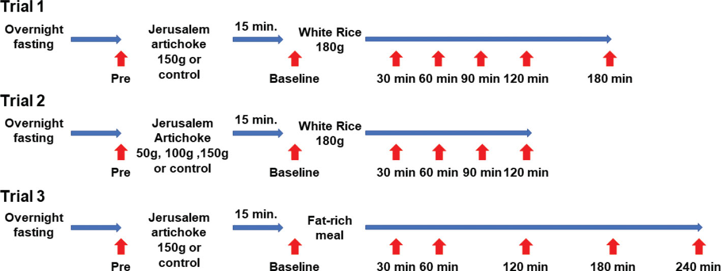 Method: Grated Jerusalem artichoke was administered prior to a meal (Trial 1; white rice for prediabetic participants, n = 10). Dose-dependent effect of Jerusalem artichoke (Trial 2; white rice for prediabetic participants, n = 4) and effect prior to the fat-rich meal were also investigated (Trial 3; healthy participants, n = 5) in this pilot study. Circulating glucose, insulin, triglyceride, glucagon, active glucagon-like peptide-1 (GLP-1), and active glucose-dependent insulinotropic polypeptide (GIP) concentrations were subsequently measured in all the trials.