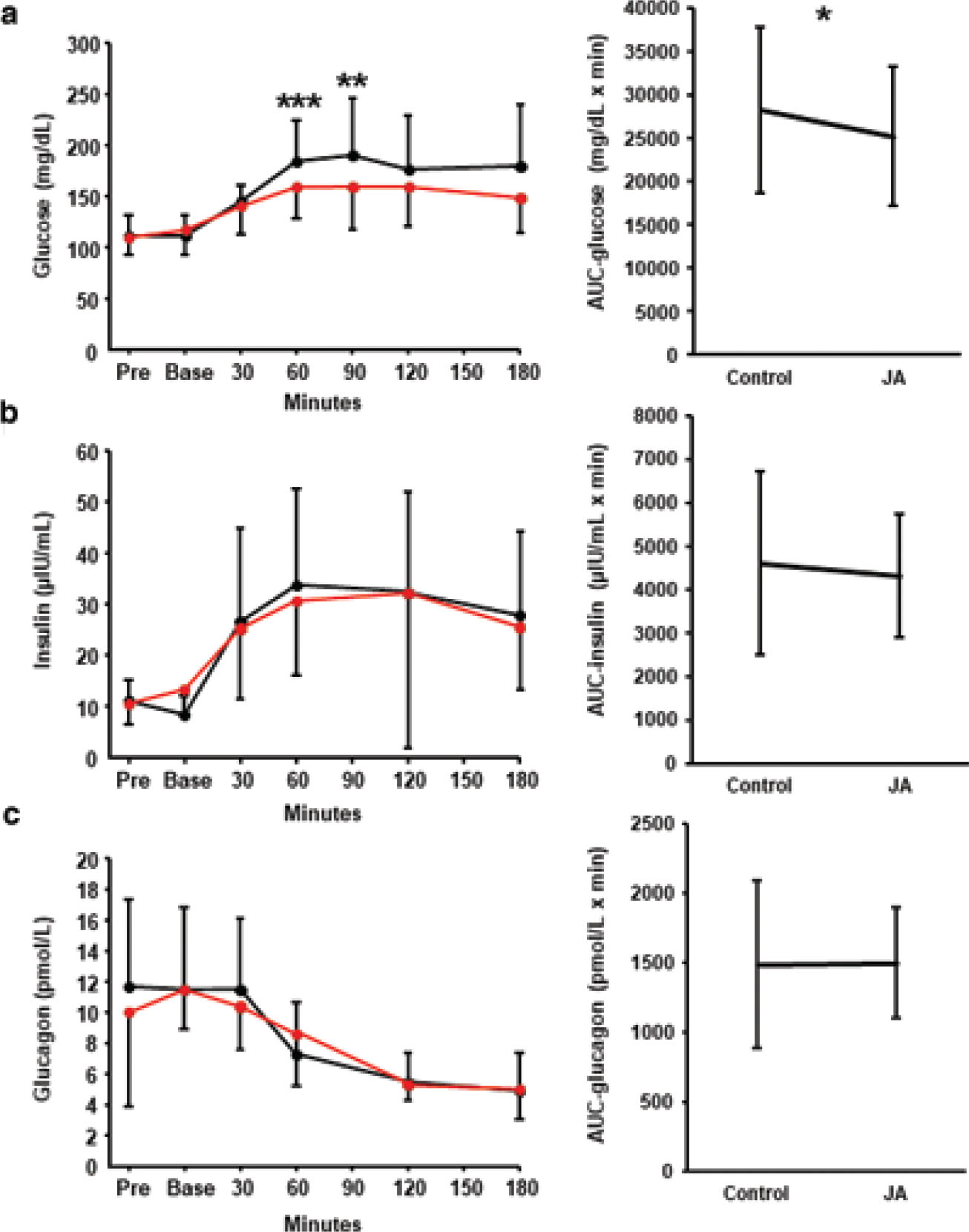 Fig. 2. Effects of Jerusalem artichoke on glucose metabolism. Jerusalem artichoke (JA) was administered prior to a white rice meal, or the rice was consumed alone, and the subsequent plasma (a) glucose, (b) insulin, and (c) glucagon concentrations were compared. Black dot and line: control meal; red dot and line: meal preceded by JA consumption. Data are means and standard deviations. *P < 0.05, **P < 0.01, and ***P < 0.001 versus control, according to the Wilcoxon signed-rank test.
