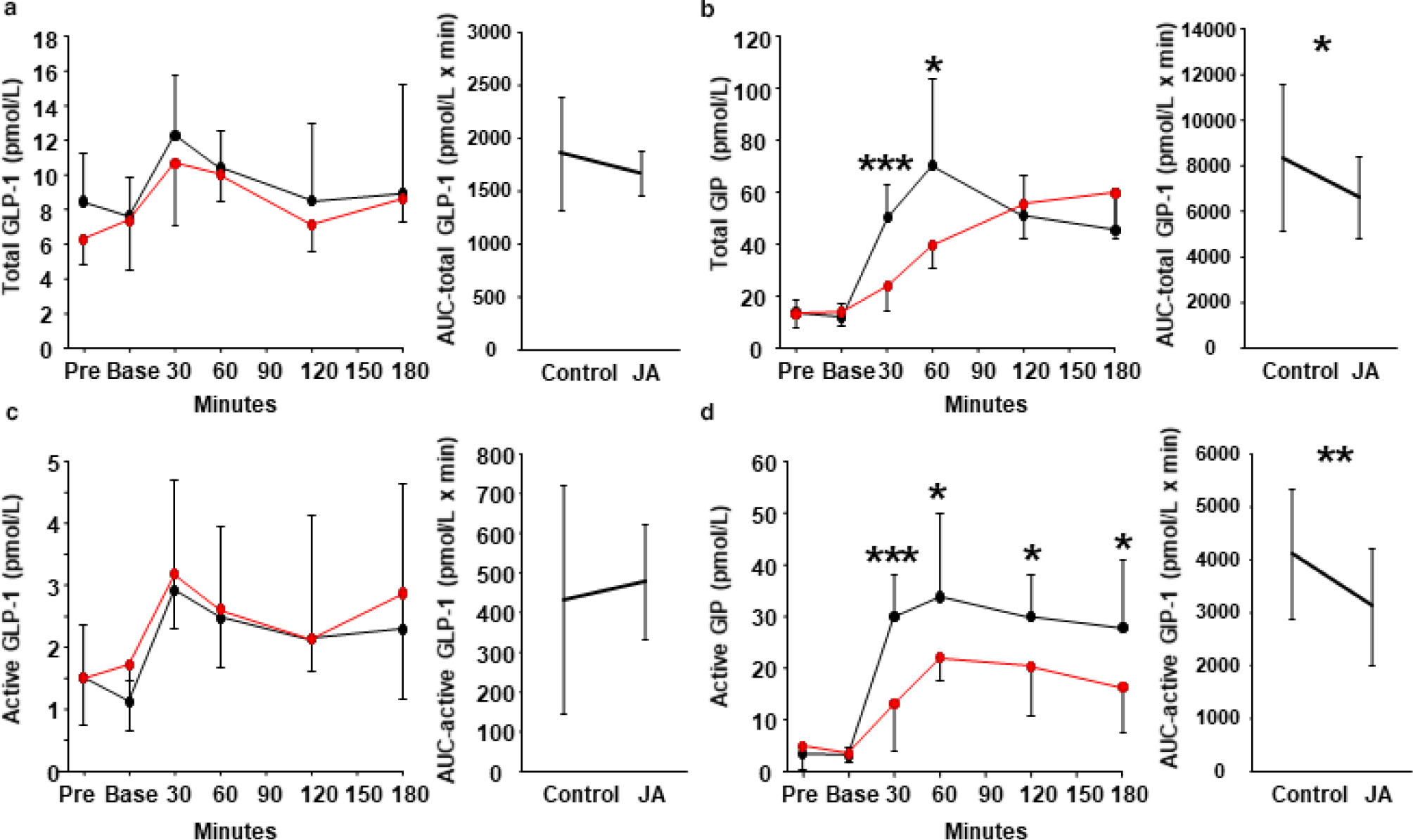 Fig. 3. Effects of Jerusalem artichoke on incretin hormone concentrations. Jerusalem artichoke (JA) was administered prior to a white rice meal, or white rice was consumed alone, and the subsequent plasma (a) total glucagon-like peptide-1 (GLP-1), (b) total glucose-dependent insulinotropic polypeptide (GIP), (c) active GLP-1, and (d) active GIP concentrations were compared. Black dot and line: control meal; red dot and line: meal preceded by JA consumption. Data are means and standard deviations. *P < 0.05, ** P < 0.01, and ***P < 0.001 versus control, according to the Wilcoxon signed-rank test.