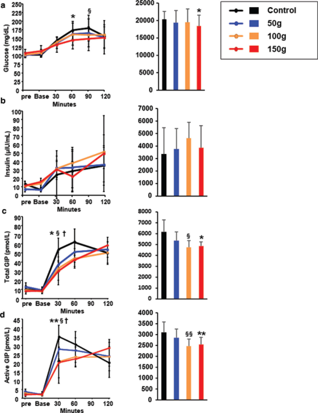 Fig. 4. Jerusalem artichoke has dose-dependent effects on glucose metabolism and glucose-dependent insulinotropic polypeptide (GIP) concentration. Jerusalem artichoke (50, 100, and 150 g) was administered prior to a white rice meal, or white rice was consumed alone, and the plasma (a) glucose, (b) insulin, (c) total GIP, and (d) active GIP concentrations were compared. Black, blue, orange, and red dots, lines, and bars represent the control meal, 50 g Jerusalem artichoke, 100 g Jerusalem artichoke, and 150 g Jerusalem artichoke, respectively. Data are means and standard deviations. †P < 0.05 for control versus 50 g, §P < 0.05 for control versus 100 g, and *P < 0.05 and **P < 0.01 for control versus 150 g, according to the Wilcoxon signed-rank test.
