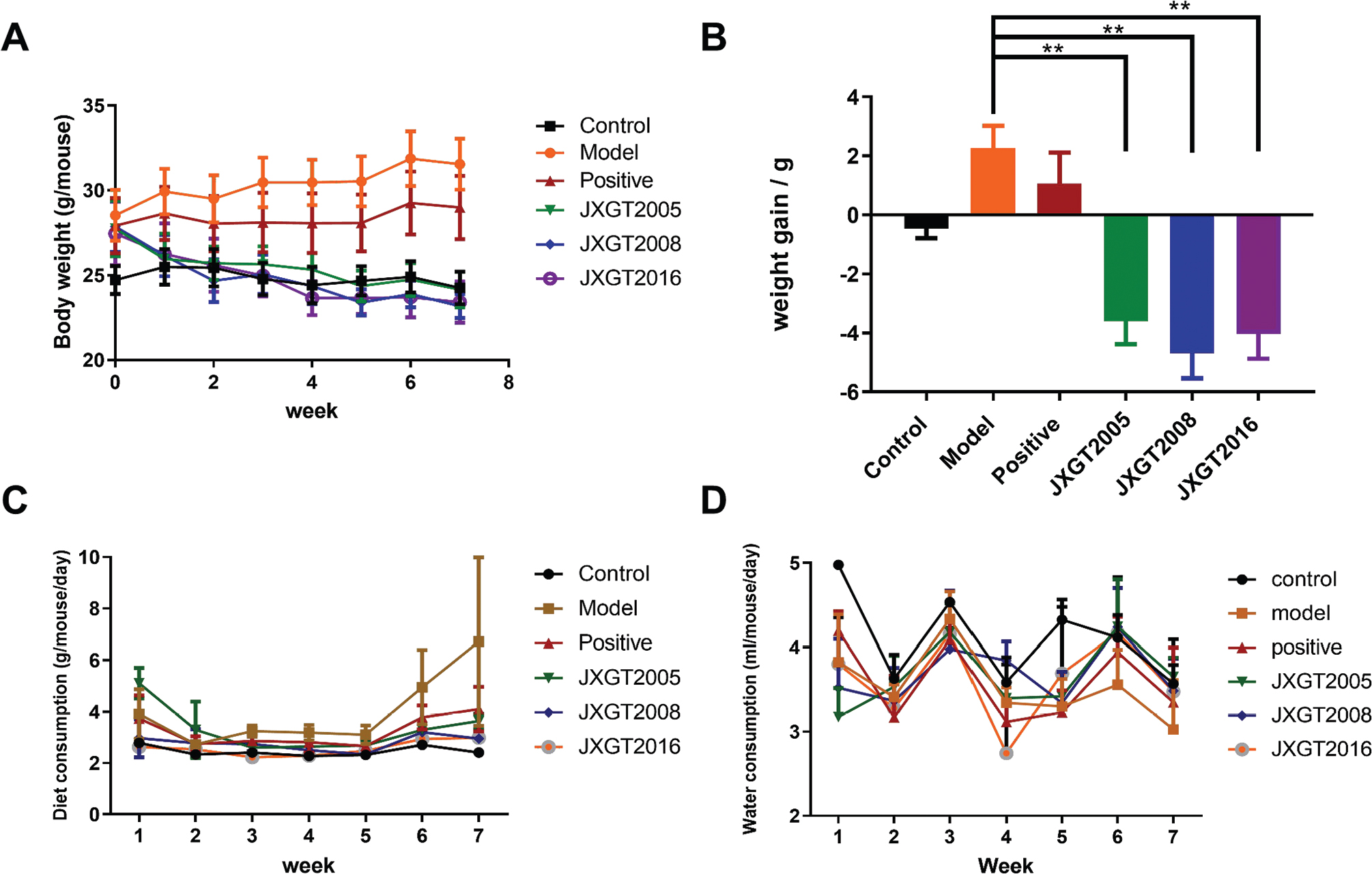 Fig. 1. Effect of JXGTs on the body weight (A), weight gain (B), diet consumption (C), and water consumption (D) of HFD-fed obese mice. Data are presented as means ± SD (n = 8). **P < 0.01 and *P < 0.05.