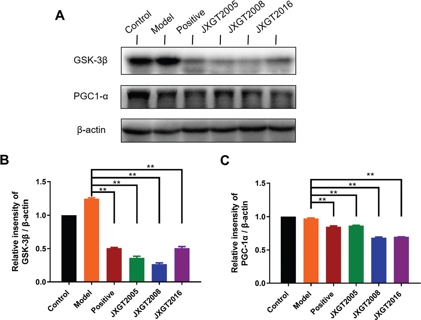 Fig. 5. JXGTs upregulate PGC-1α and inhibit GSK-3β expression. (A) Immunoblot showing expression levels of GSK-3β and PGC-1α protein in mouse liver and densitometric quantification of (B) GSK-3β and (C) PGC-1α. Data are presented as means ± SD (n = 3). **P < 0.01 and *P < 0.05.