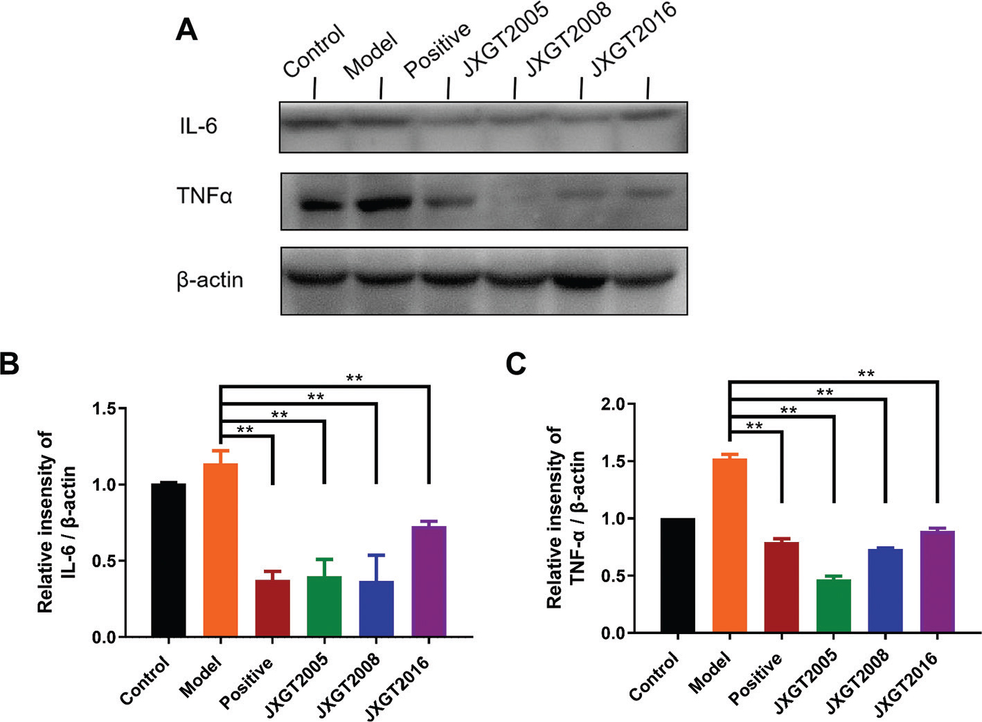 Fig. 6. JXGTs inhibit IL-6 and TNF-α expression. (A) Immunoblot showing IL-6 and TNF-α protein levels in mouse liver and densitometric quantification of (B) IL-6 and (C) TNF-α. Data are presented as means ± SD (n = 3). **P < 0.01 and *P < 0.05.