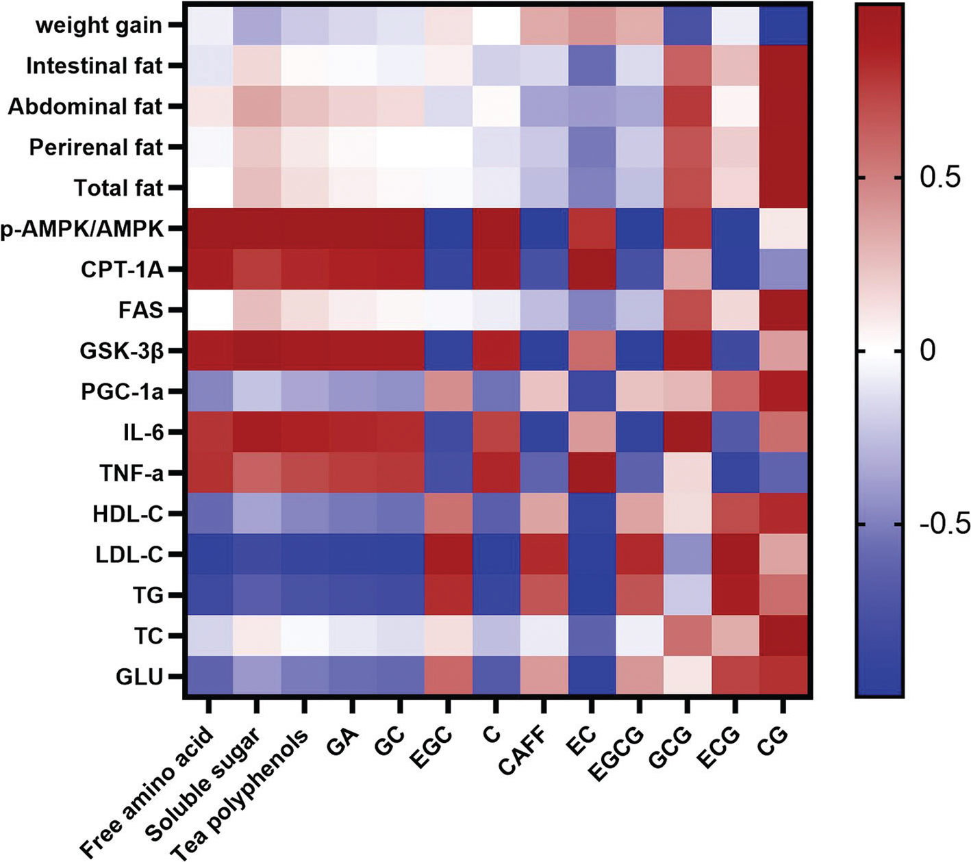 To further evaluate the role of tea-derived phytochemicals against obesity, we analyzed the Pearson correlation between the phytochemical composition of JXGTs and various parameters of obesity and inflammation (Fig. 7). The content of tea polyphenols, amino acids and soluble sugar was positively correlated with AMPK pathway activation, as well as most anti-inflammatory parameters. Furthermore, GCG (GCG) and catechin gallate (CG) were positively correlated with the loss of body weight.