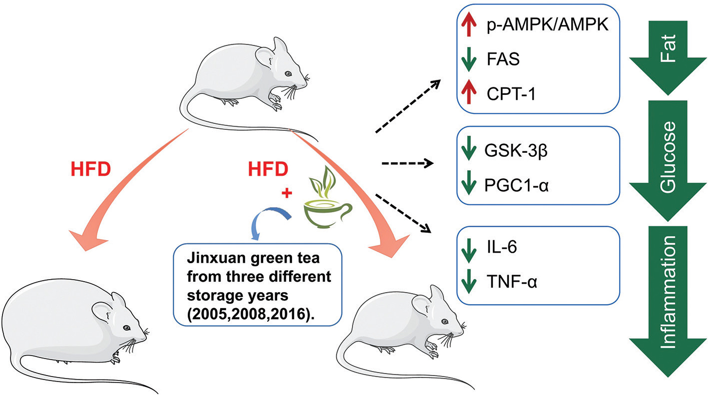 The aim of this study was to evaluate the effects of Jinxuan Green teas (JXGTs) from three different years on the high-fat diet (HFD)-fed mouse model for determining the effect of its prolonged storage on the anti-obesity components of green tea. We found that JXGTs alleviated HFD-induced weight gain by elevating the p-AMPK/AMPK ratio, and the activated AMPK mitigated lipid synthesis and balanced energy metabolism through the CPT-1A/FAS and GSK-3β/PGC-1α pathways, respectively. Furthermore, JXGTs inhibited obesity-induced inflammation by downregulating pro-inflammatory factors, such as IL-6 and TNFα. Taken together, JXGT mediates anti-obesity and anti-inflammatory effects that warrant further investigation.